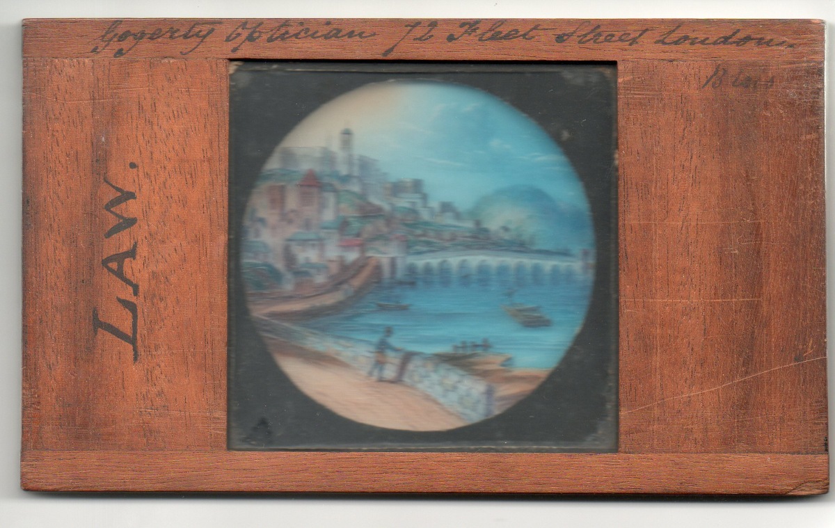 Plaque peinte de lanterne magique, Gogerty Optician, 72 Fleet Street à Londres, actif entre 1837-1856, 17 x 10 cm