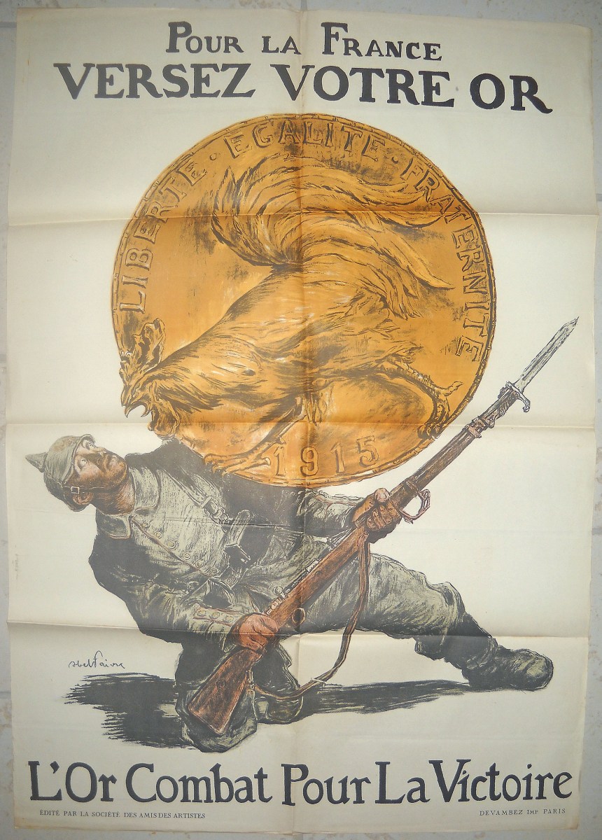 Cette affiche de la Première Guerre mondiale, publiée à Paris en 1915, exhorte les citoyens français à verser leurs pièces d'or " pour la France " à l'aide du slogan " l'or combat pour la victoire ". Le gouvernement français avait besoin d'or pour acheter le matériel militaire nécessaire en temps de guerre auprès des États-Unis et d'autres pays, d'où l'appel aux citoyens pour transformer leurs pièces d'or en dépôts bancaires. Au centre de l'affiche, une pièce d'or, portant l'emblème symbolique du coq gaulois en relief, écrase un soldat allemand pour illustrer cette idée. L'affiche est d'Abel Faivre (1867-1945), célèbre illustrateur et caricaturiste qui produisit un grand nombre d'illustrations pour des publications telles que Le Figaro, Le Journal, L'Écho de Paris et Le Canard sauvage, durant sa longue carrière de 1895 à 1942. Faivre créa de nombreuses affiches pour soutenir l'effort de guerre français. Cette affiche fut publiée par Devambez, maison de graveurs et d'imprimeurs reprise par Édouard Devambez en 1873, puis par son fils André Devambez. Spécialisée dans l'impression de qualité d'uvres d'art, la maison produisit également de nombreuses affiches populaires pendant la guerre.