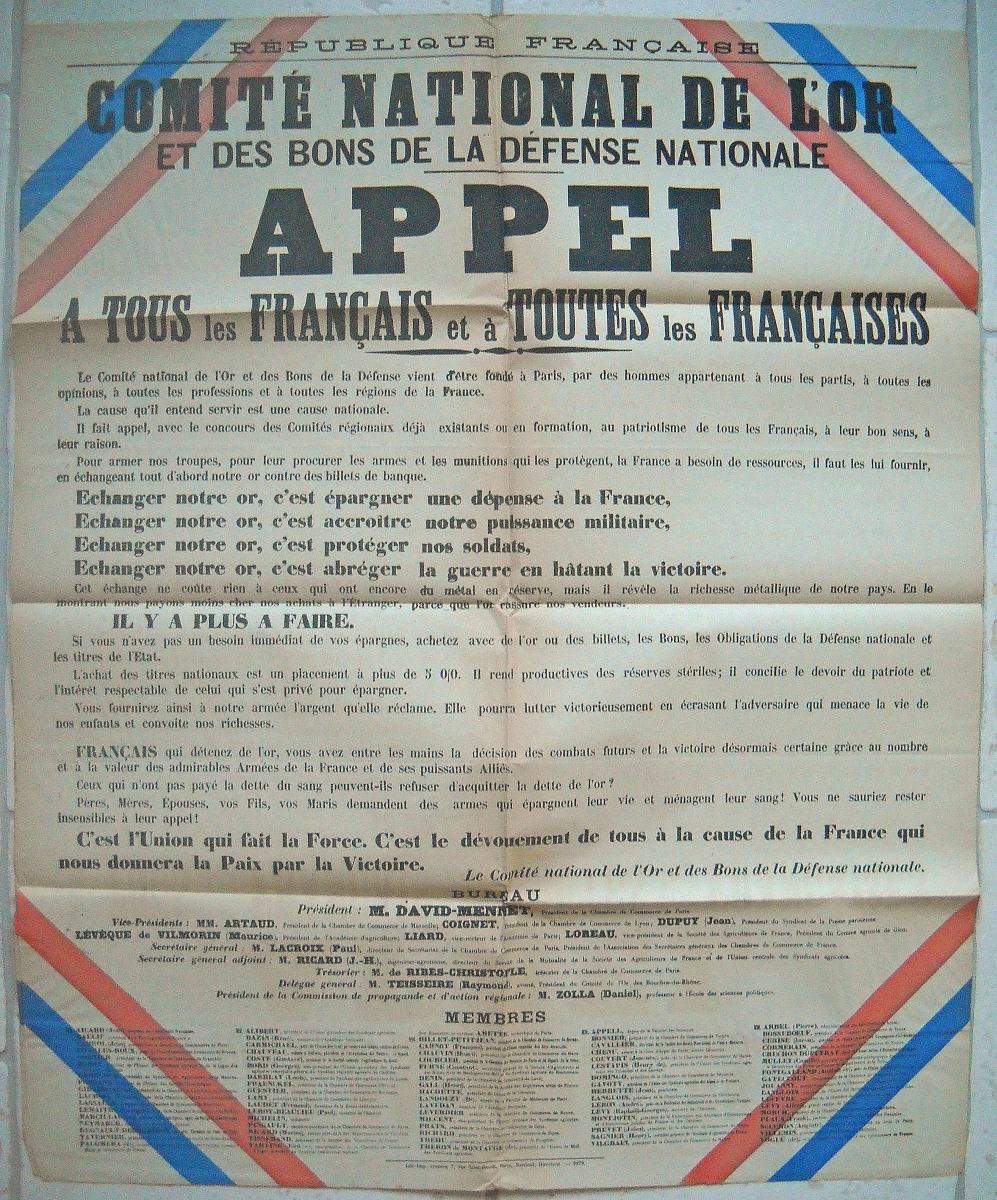 2 affiches: "Comité national de l'or et des Bons de la Défense Nationale. Appel à tous les Français et à toutes les françaises. Échanger notre Or, c'est épargner une dépense à la France, c'est accroitre notre puissance militaire, c'est protéger nos soldats, c'est abréger la guerre en hâtant la victoire... C'est l'union qui fait la Force. C'est le dévouement de tous à la cause de la France qui nous donnera la Paix par la Victoire." [1915], Lib. Impr. réunies 7 rue St Benoit, Martinet Directeur, 111 x 90 cm, traces de plis, T.B.E. - 6 affiches: " Pour la France, versez votre or. L'or combat pour la victoire. " [1915] par Abel Faivre, Imp. Devambez Paris, 114 x 79 cm, traces de plis, T.B.E.