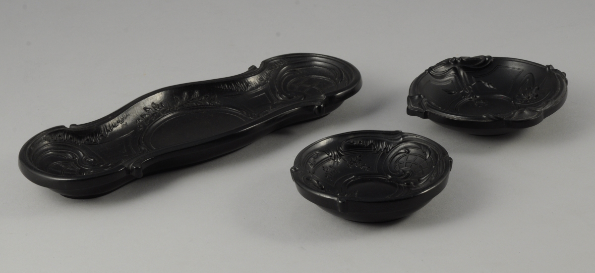 ENSEMBLE comprenant trois COUPES, une oblongue et deux circulaires, en gomme laquée moulée. Décor floral de style Art Nouveau, pour l'une et d'agrafes et rinceaux feuillagés de style Louis XV, pour les deux autres.