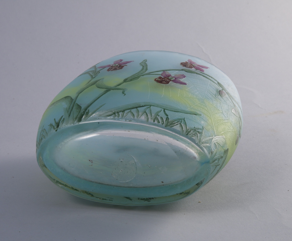 DAUM. VASE légerement bombé en verre muticouche bleu et jaune, décoré à la roue de fleurs de lys et de toiles d'araignées, réhaussée à l'émail.