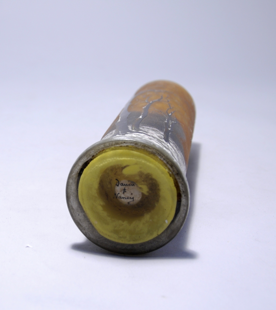 DAUM NANCY. Rare VASE ROULEAU en verre doble épais au décors d'arbre en hiver dégagé à l'acide puis peint.
