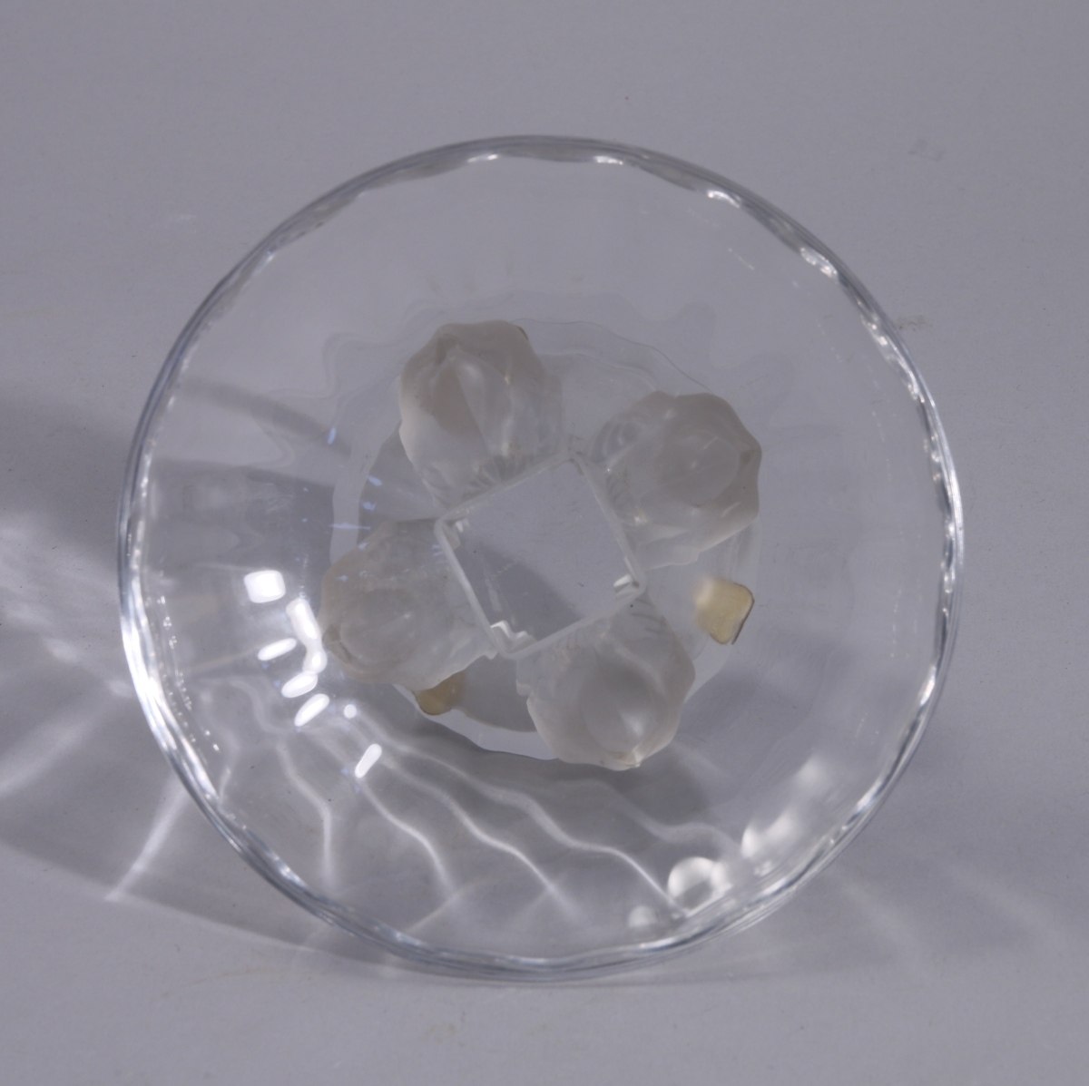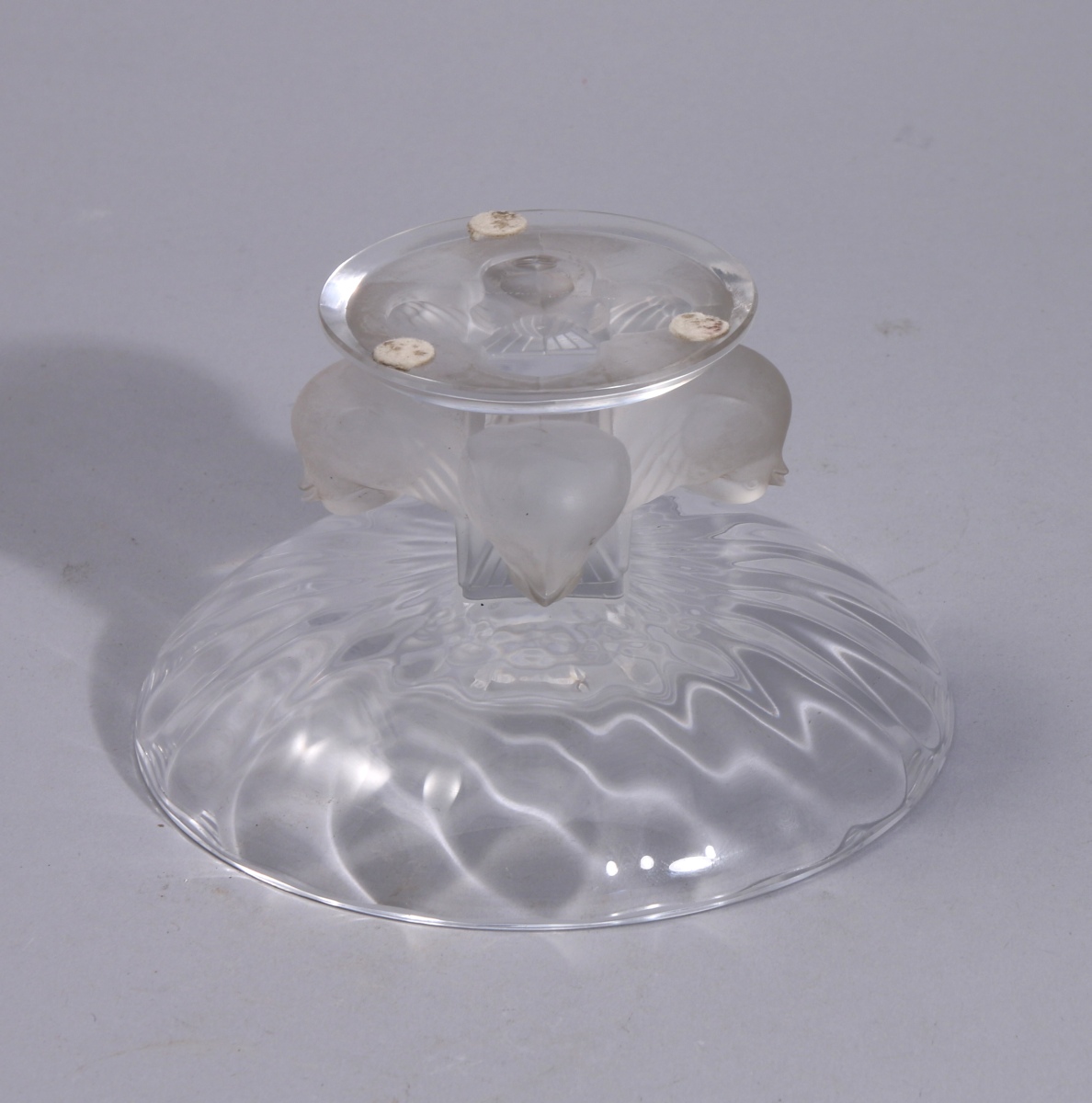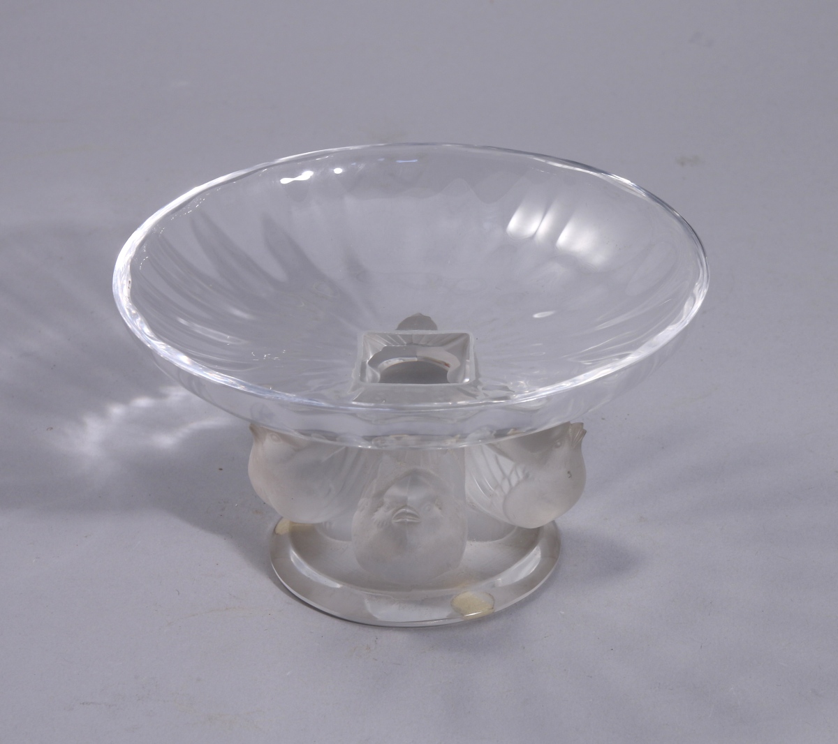 LALIQUE. Petite COUPE "NOGENT" de forme circulaire soutenue par quatre pinsons en verre moulé-pressé.