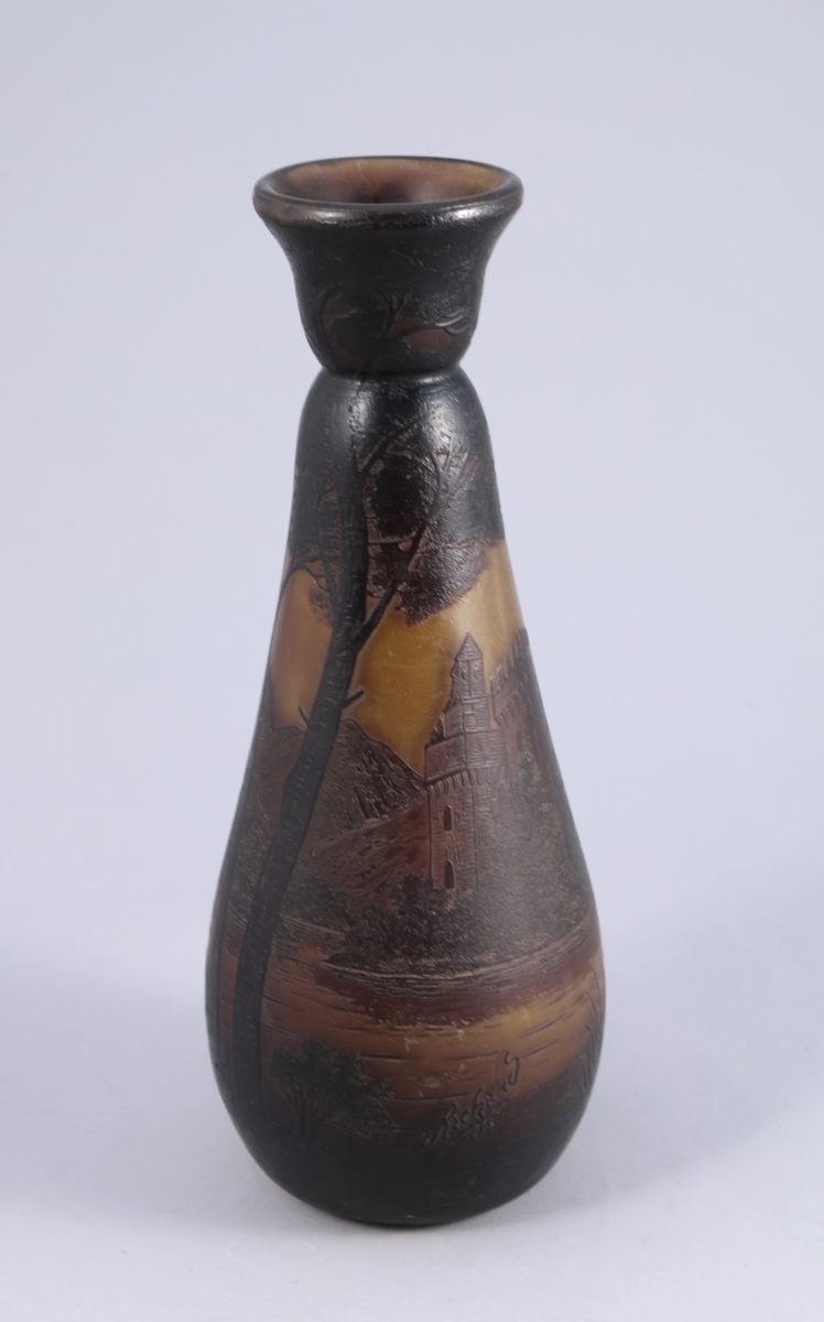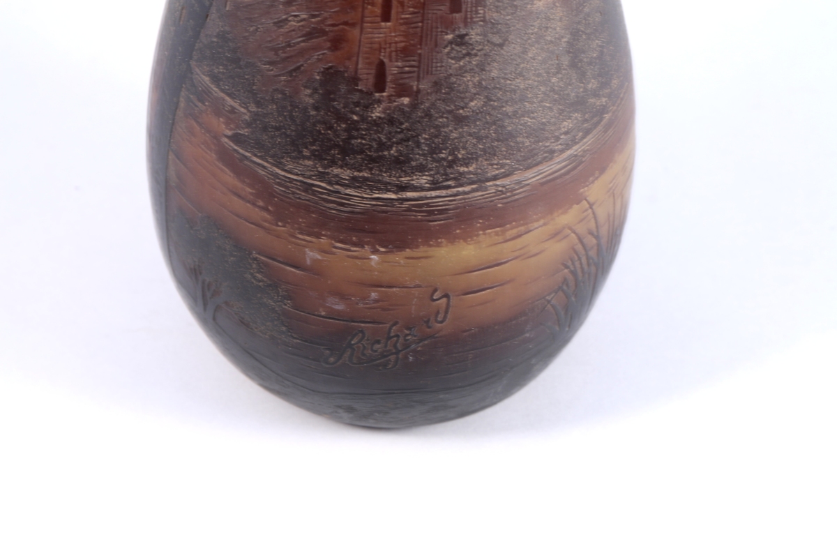 VASE GOURDE en verre multicouche gravé d'un paysage aux pins parassols et au château médiéval en bord de rivierre. Signé Richard.