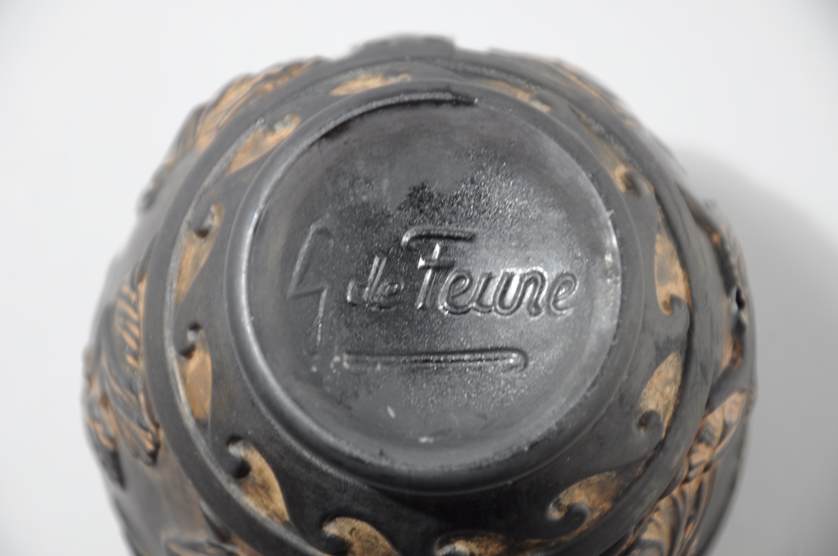 VASE ovoïde sur talon en verre violacé à décor moulé de danseuses à l'Antique. Une frise de postes en partie inférieure. Signé.