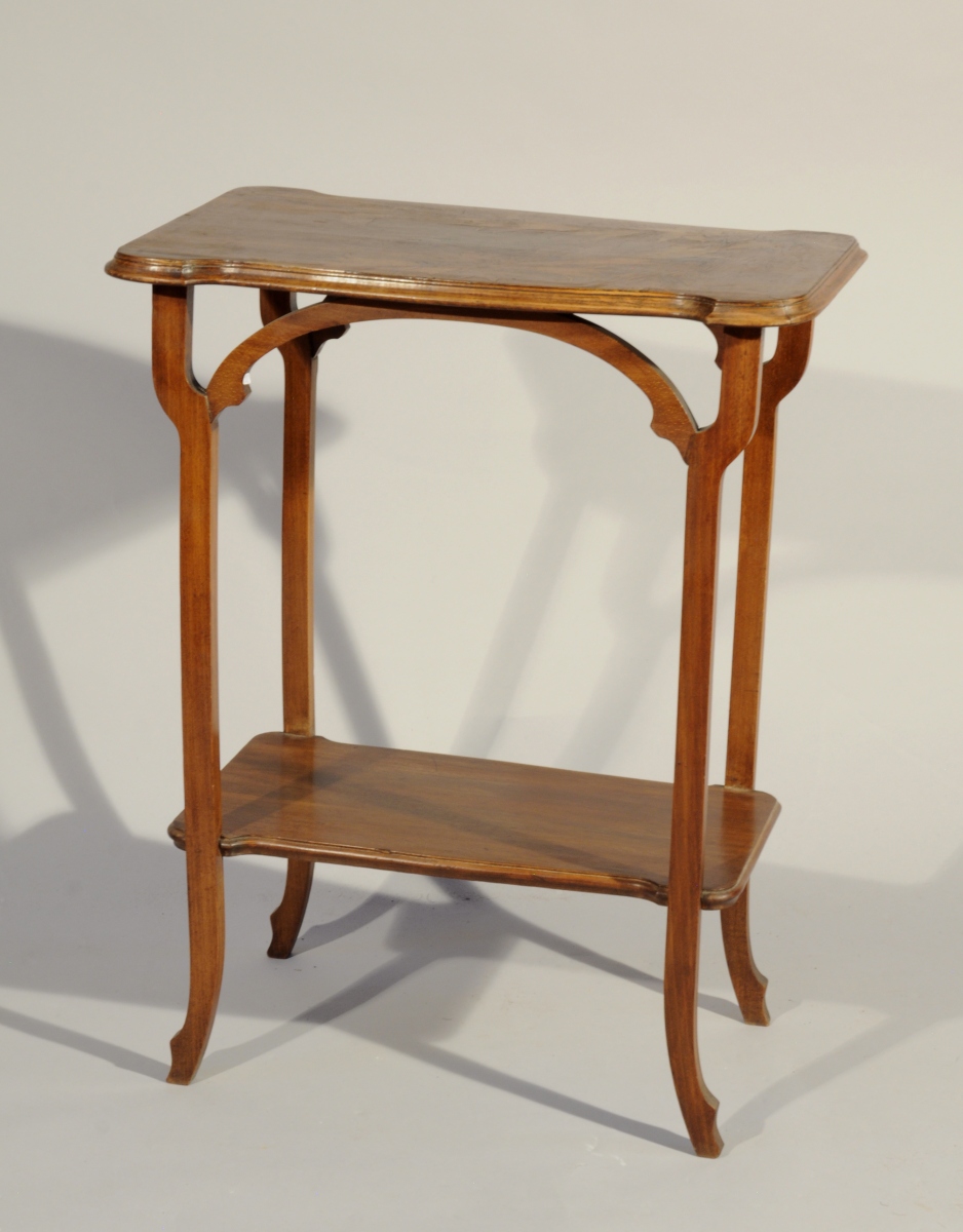 TABLE À THÉ à deux plateaux rectangulaires incurvés en poirier, noyer, chêne et bois d'amourette.