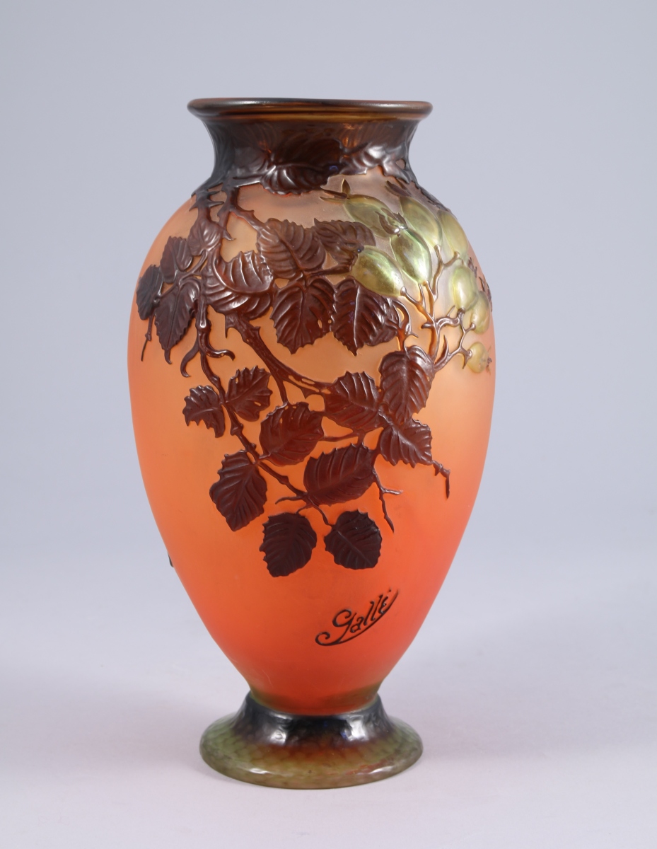 GALLÉ. VASE balustre en verre pressé et moulé à décor de fruits d'églantier de couleur jaune et prune sur un fond orangé.