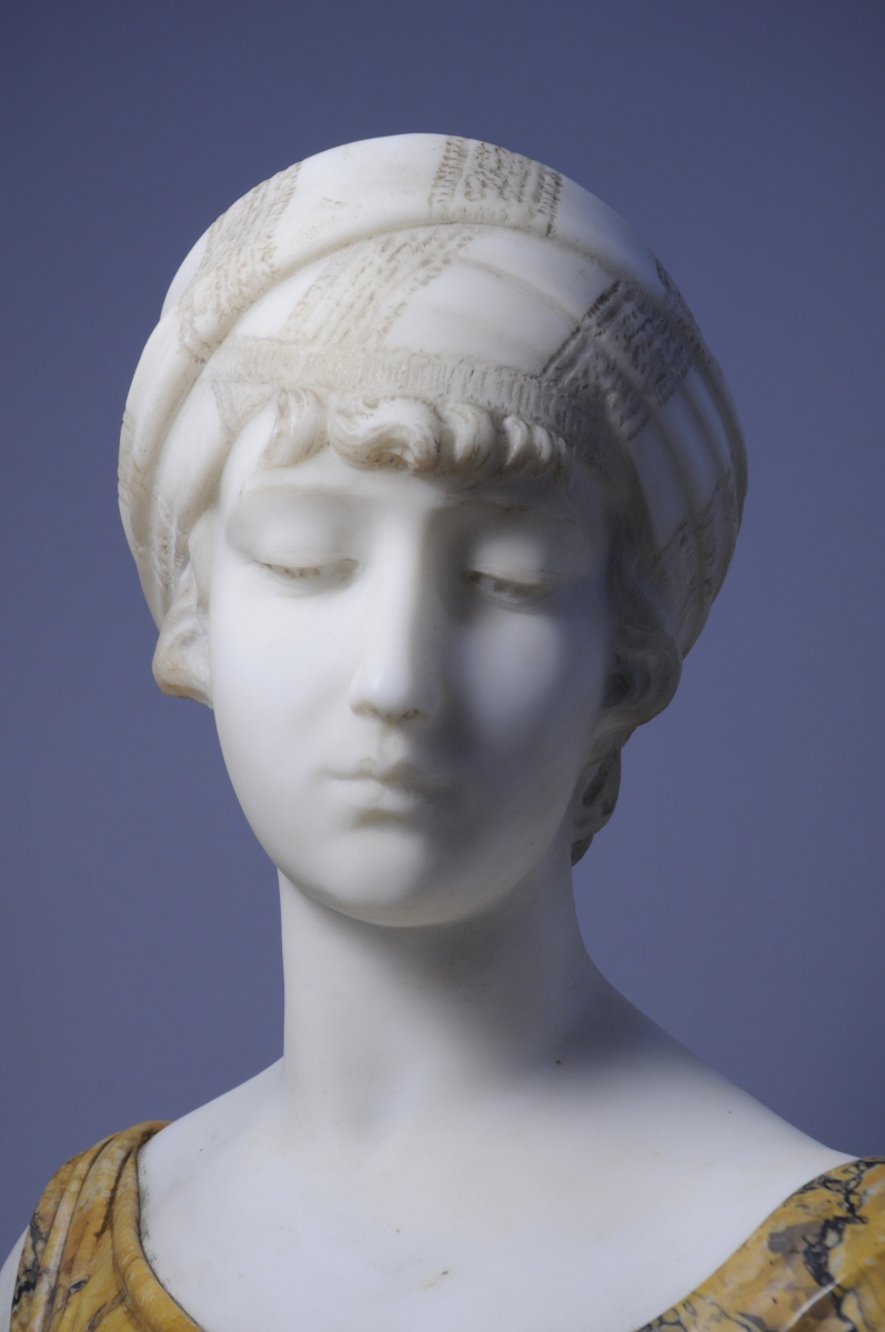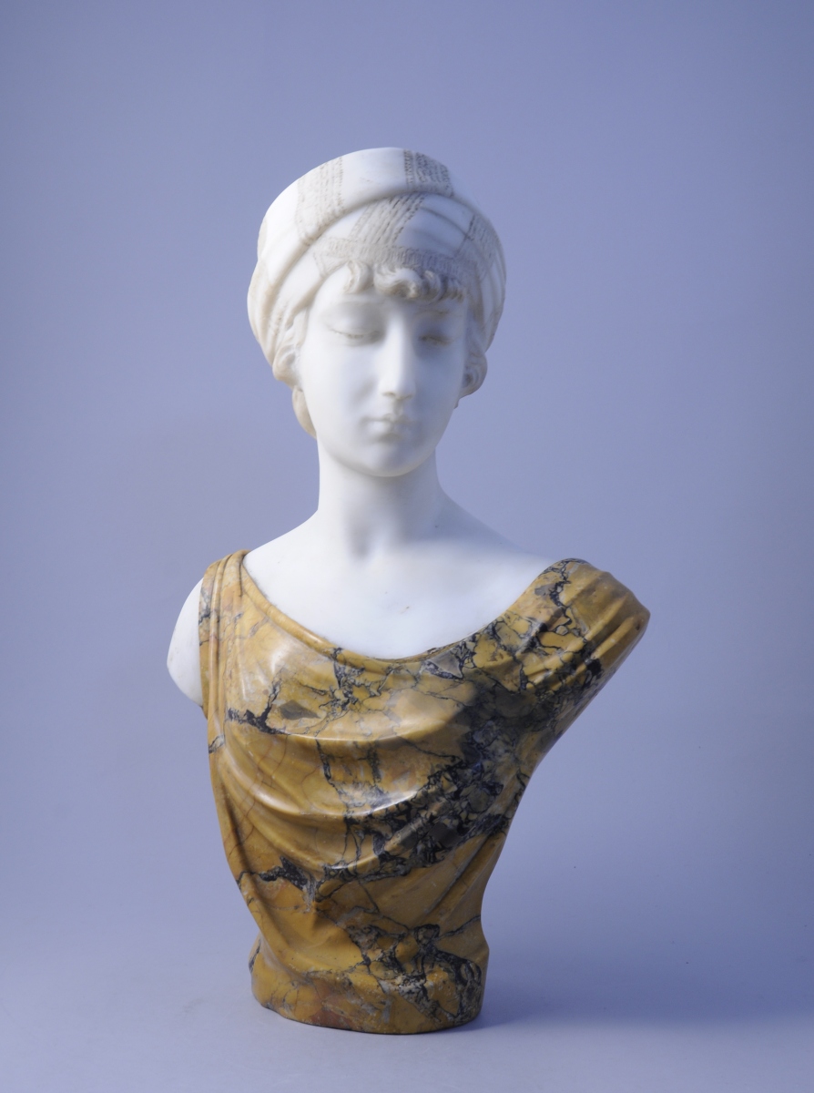 BUSTE de FEMME en marbre blanc, sa tunique en marbre jaune de Sienne coiffée d'un turban.