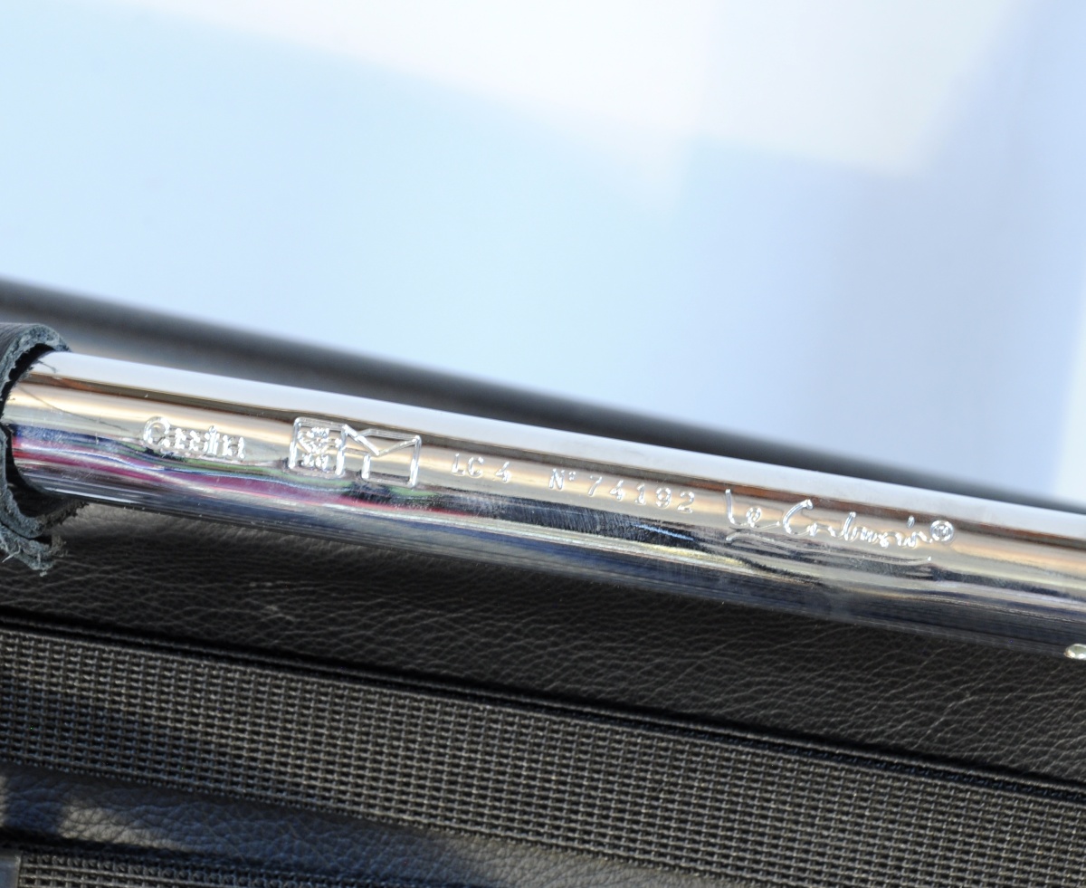 CHAISE LONGUE modèle "LC4" en métal tubulaire nickelé, revêtement de cuir noir composé d'un matelas et d'un coussin noir.