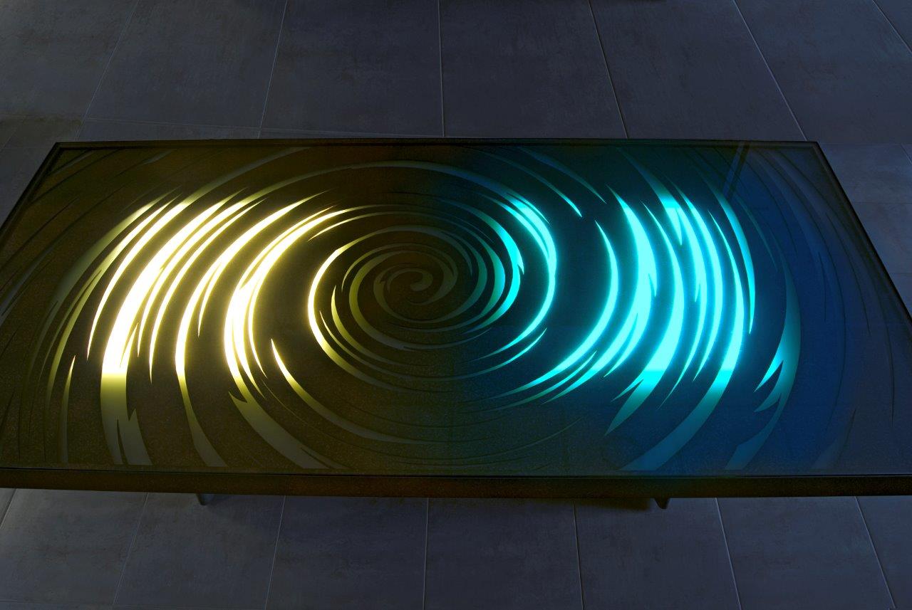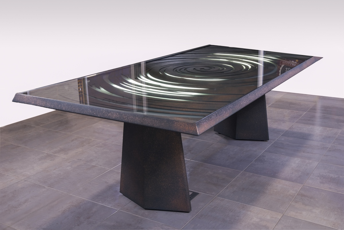 TABLE "VENDÔME" en acier epoxy rouille, le plateau de forme rectangulaire à découpe métallique en spirale lumineuse (Led) protégé par un plateau de verre sécurite. Bords repliés. La table repose sur deux pieds en losange.