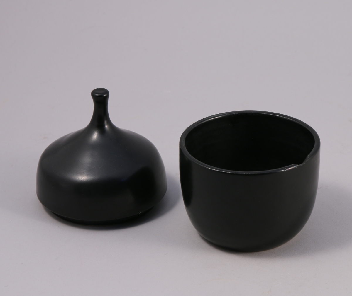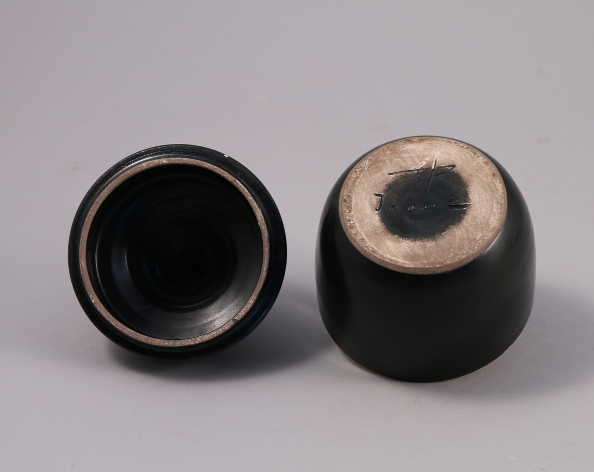 POT COUVERT piriforme en céramique émaillée noir. Prise éfilée. Signé et monogrammé en creux sous la base.