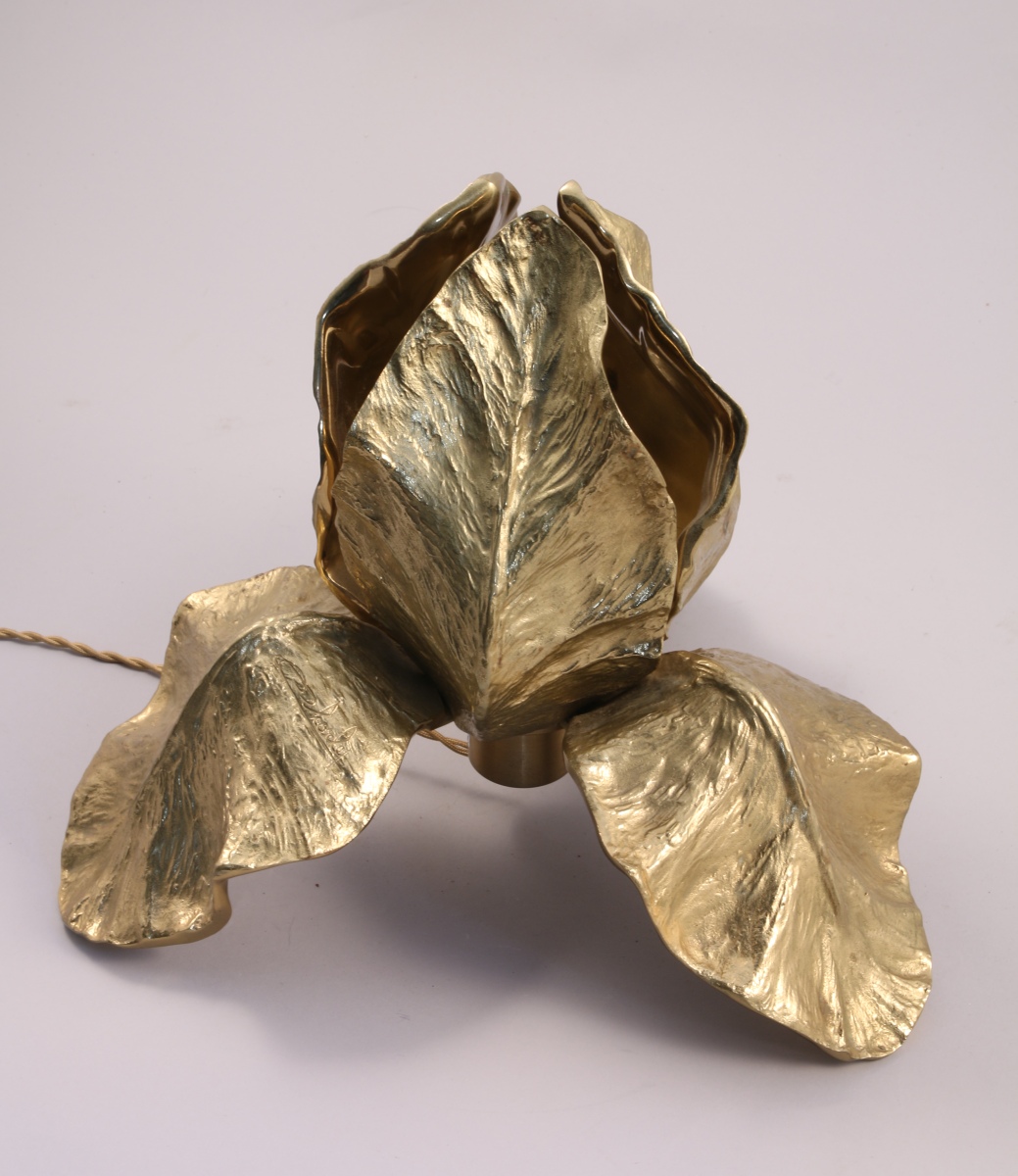 LAMPE en bronze doré figurant une fleur d'iris. Elle repose sur les trois pétale inférieurs.