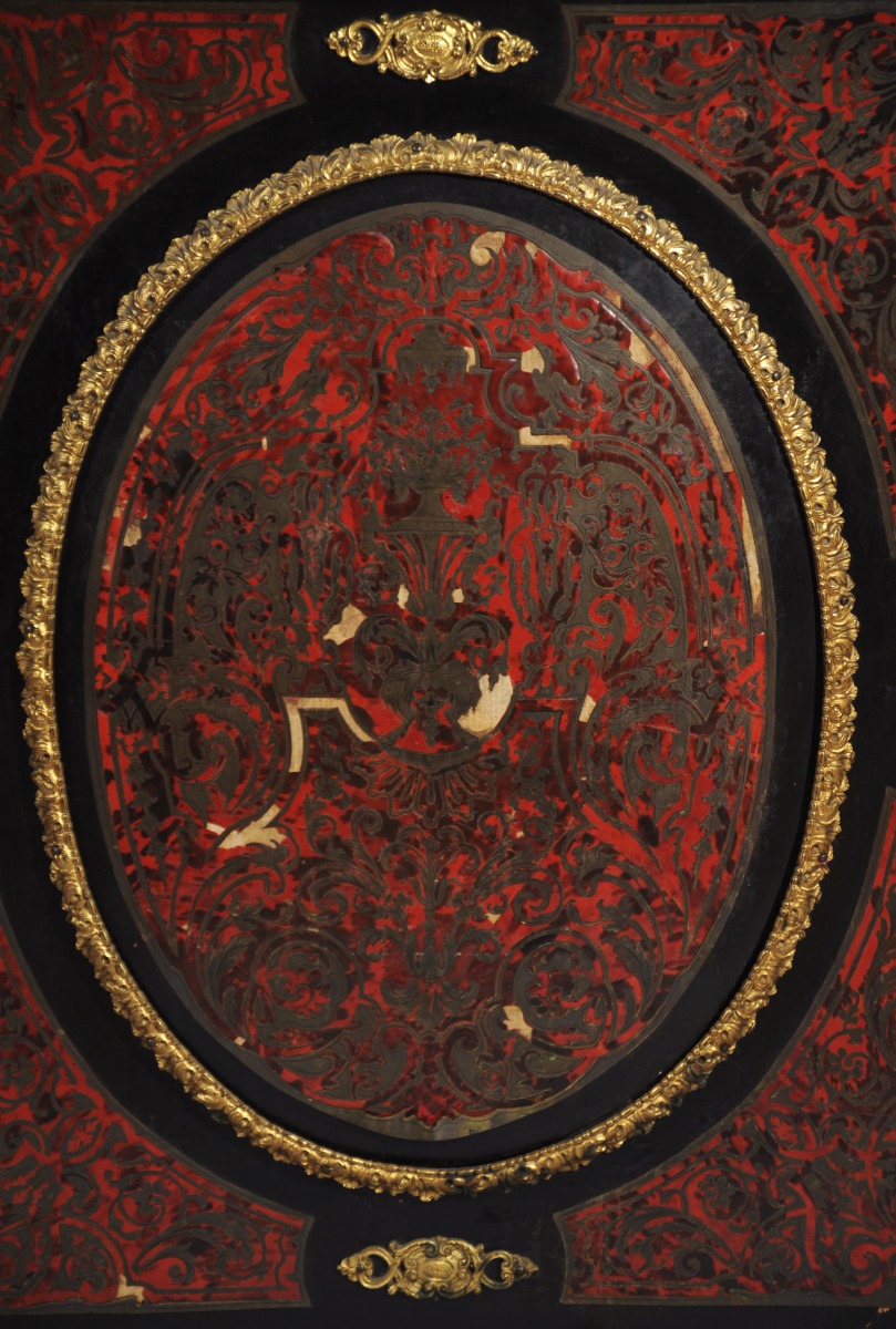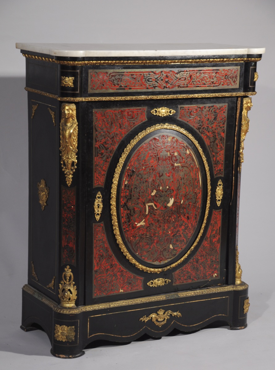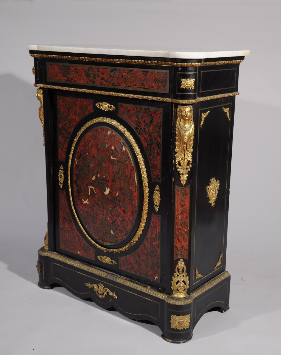 MEUBLE À HAUTEUR D'APPUI de forme rectangulaire ouvrant à une porte en façade, en bois noirci et marqueterie dite boulle en partie de laiton sur fond d'écaille. Riche décor de rinceaux à la Bérain. Garniture de bronzes ciselés et dorés tels que espagnolettes, frises, fleurons, entrée de serrure et cul-de-lampe. Traverse basse découpée. Dessus de marbre blanc.