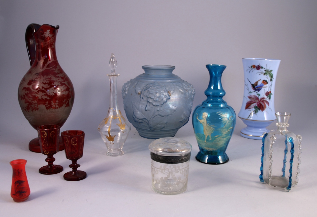 - AIGUIÈRE de forme balustre reposant sur un piédouche en cristal bicouche, rouge et translucide. Il reçoit un fin et riche décor gravé de cerfs et biche dans un sous-bois. Travail allemandou austro-hongrois, fin XIXe. Haut. 31 cm.