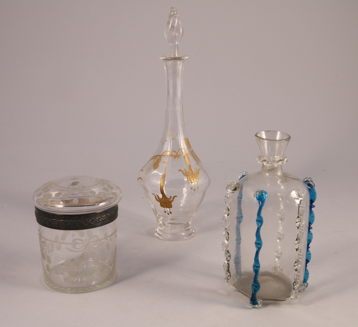 - FLACON en verre tranparent à décor circulaire à l'or d'un rameau de fushia. Art Nouveau. Haut. 24 cm. (accidents au bouchon)