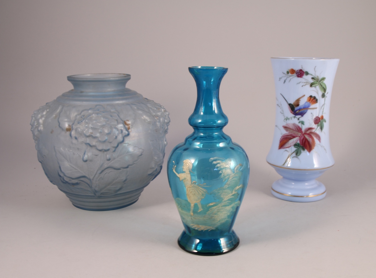 - VASE en opaline bleue à décor polychrome d'un colibri branché dans un mûrier. XIXe.