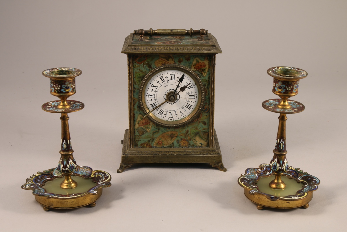 - Paire de FLAMBEAUX en bronze doré et émail cloisonné polychromme à décor végétal stylisé. Base chantournée foncée d'une plaque d'onyx.