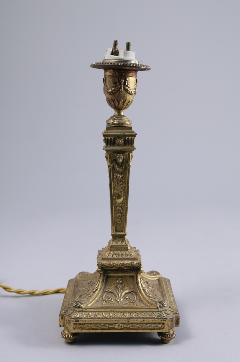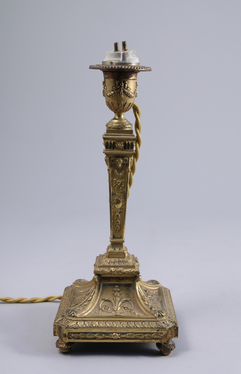 Petit FLAMBEAU en bronze finement ciselé et doré. Riche décor néoclassique de rubans noués, guirlandes de feuilles, têtes de bélier, tores de lauriers, médaillons, frises de feuilles d'eau, rais de coeurs et rinceaux. Fût gaine soutenu par une base de forme carrée à quatre pans trapézoïdaux. Il repose sur quatre pieds toupie.