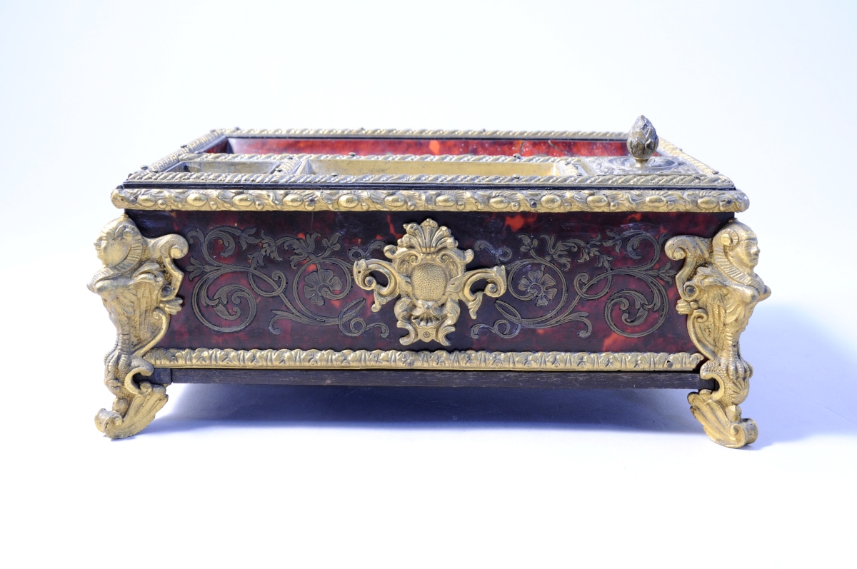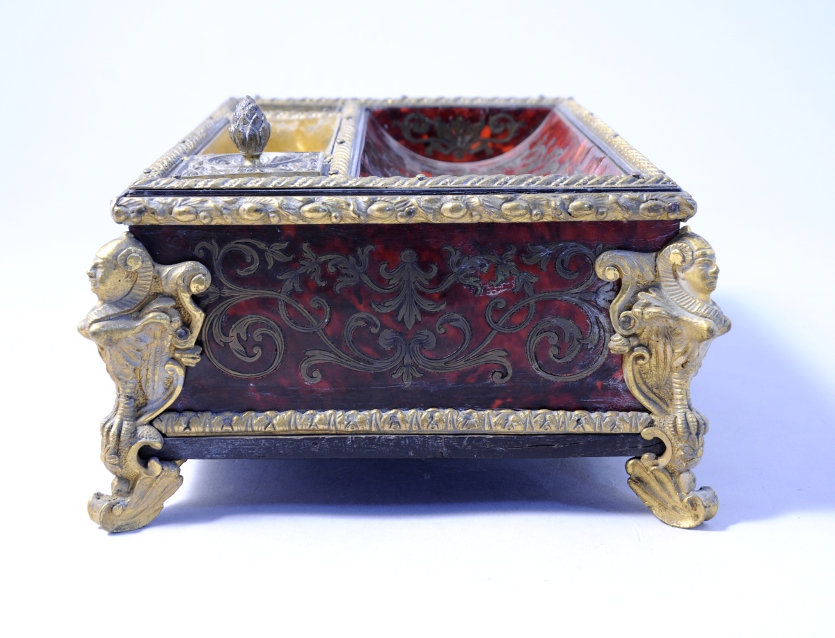 Belle garniture en bronze ciselé et doré telle que quatres pieds ailés, quatre sphinx gainés aux arêtes, deux médaillons feuillagés agrémentés de coquilles, frises torsadée, de feuilles d'acanthe et de fleurs. Le plateau comprend un encrier, un sablier, un plumier en cuivre et un porte-plume en marqueterie d'écaille rouge et laiton. L'encrier est muni d'un couvercle en bronze doré surmonté d'une pomme de pin.