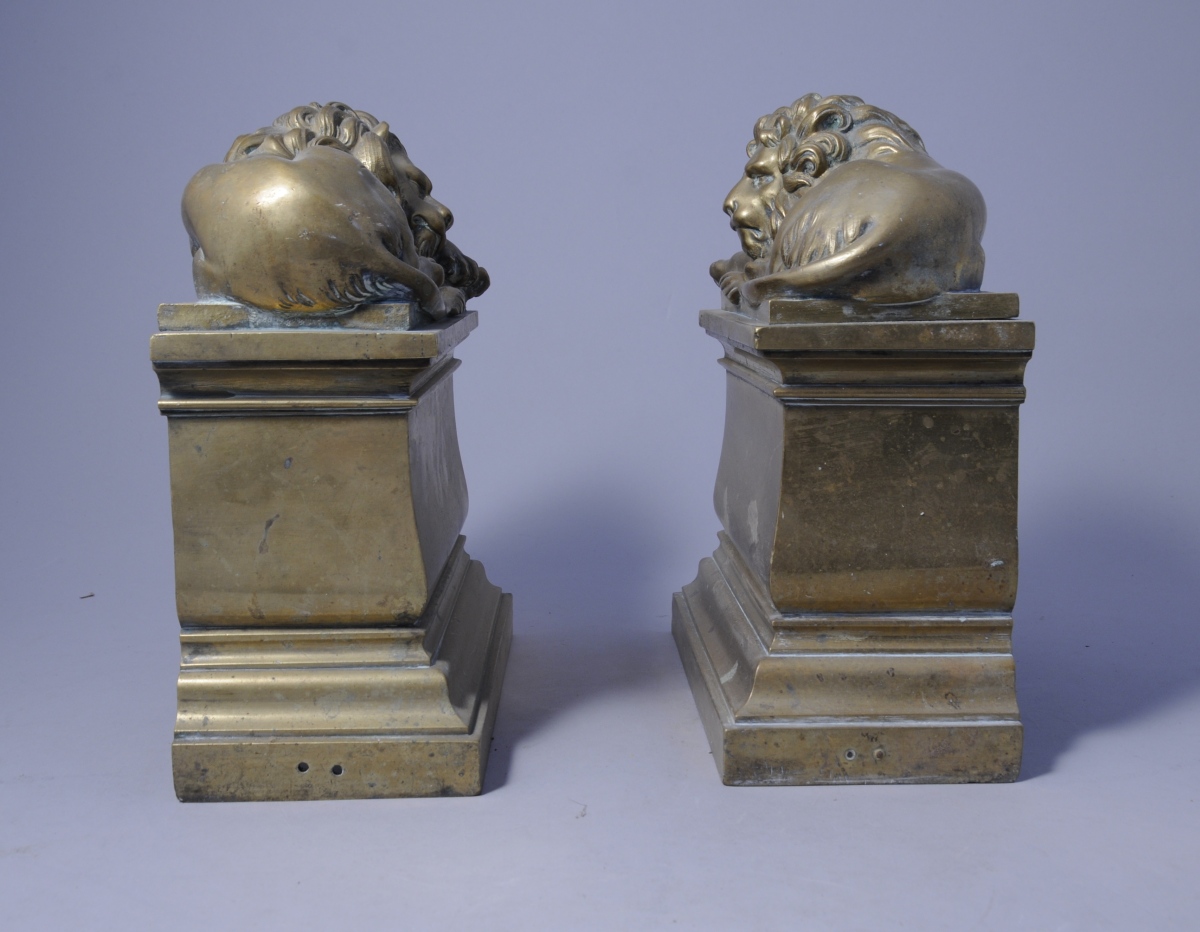 PAIRE DE FEUX en bronze ciselé et doré figurant deux lions endormis sur un socle à doucine.