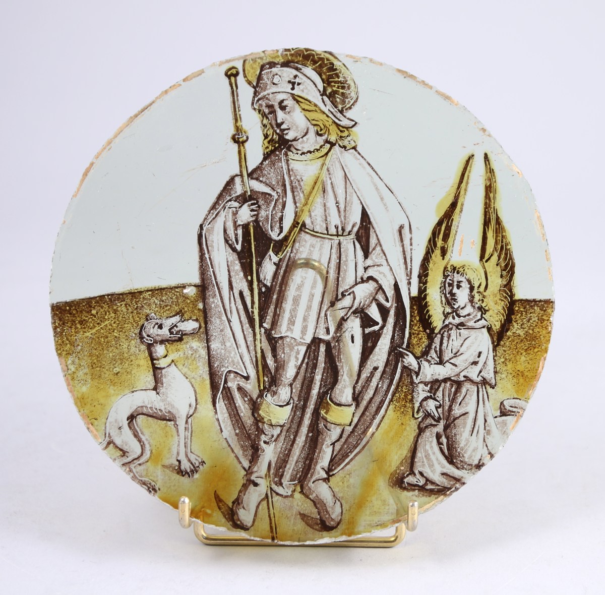 Saint ROCH. Vitrail à jaune d'argent, en forme de tondo. Il figure saint Roch, un chien à sa droite, un ange à sa gauche.
