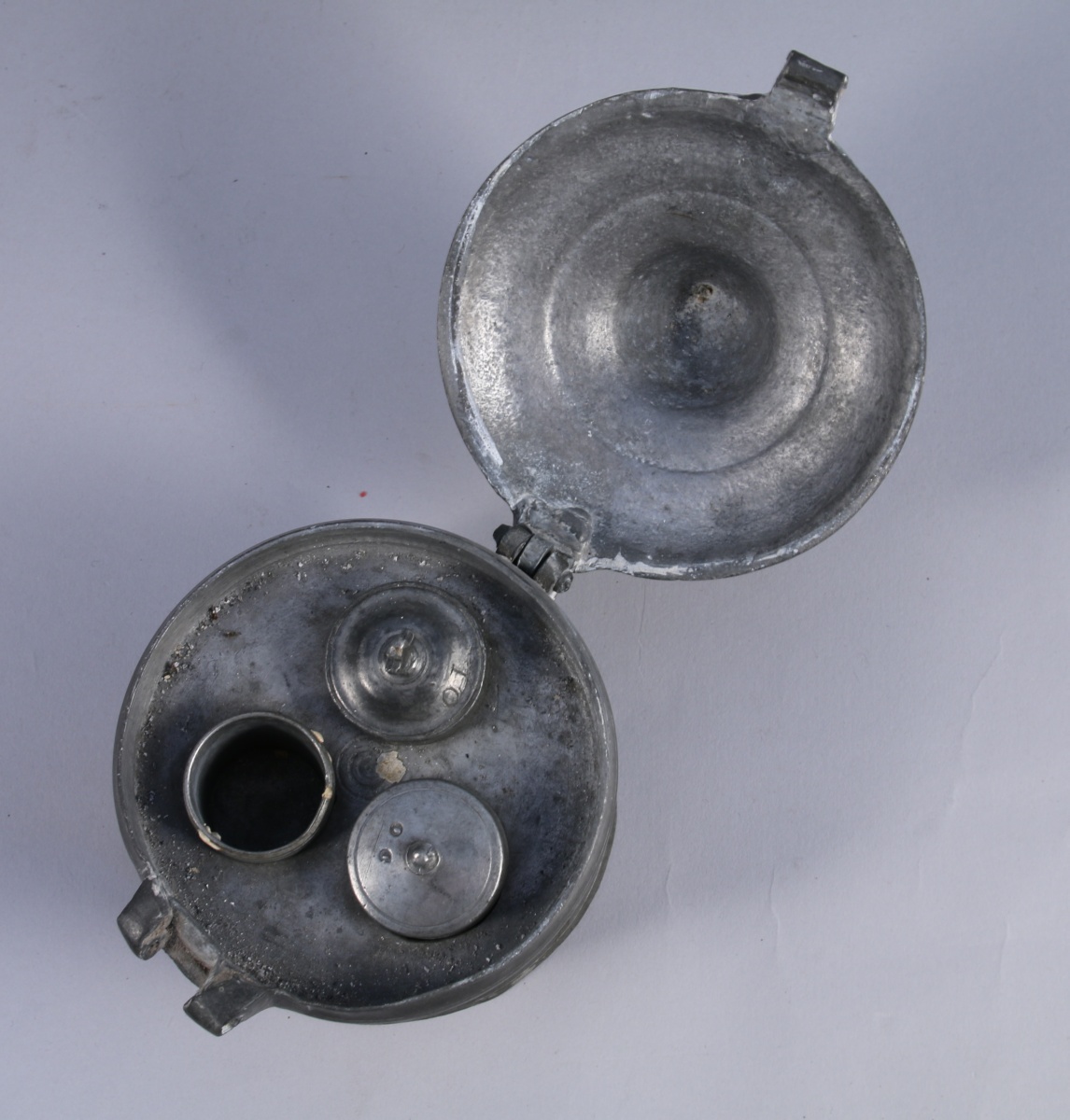 - COFFRET à AMPOULES AUX HUILES SAINTES de forme circulaire. Couvercle conique à charnière. Contient trois ampoules dont une rapportée et une sans couvercle. Haut. 11, Diam. 10,5 cm. (manques)