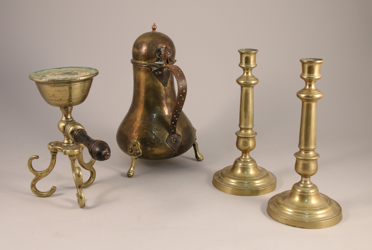 - CAFETIÈRE balustre à large panse basse. Couvercle hémisphérique sommé d'un fretel toupie en cuivre. Anse en fer forgé.Piètement tripode à attaches cloutées de cuivre. XVIIIe. Haut. 30 cm.