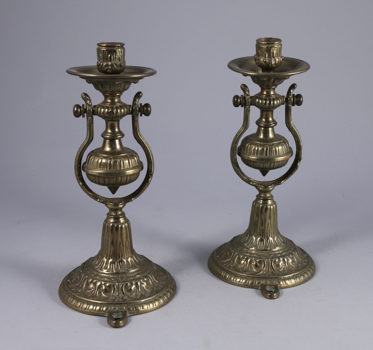 PAIRE de FLAMBEAUX DE MARINE en laiton fondu richement orné de feuillages stylisés, agrafes et godrons. Bobèche et binet sur fût lesté articulé sur un support en lyre. Base de forme circulaire agrémentée d'un anneau de fixatiion.
