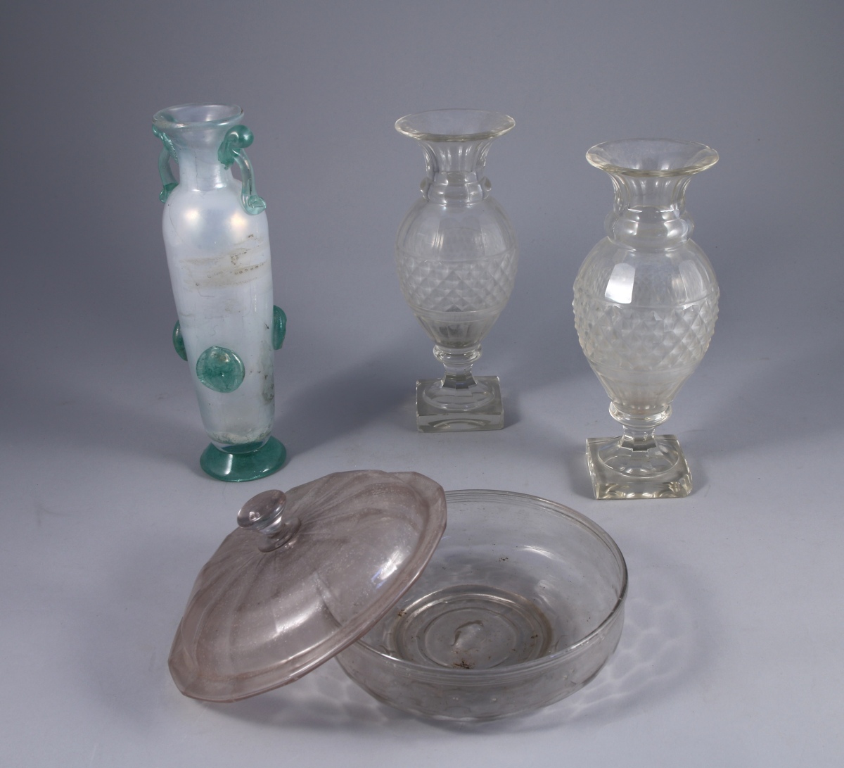 - DRAGEOIR de forme circulaire en verre soufflé transparent. Le corps à décor d'alvéoles et filets sur le col repose sur un talon. Couvercle bombé à pans orné de côtes saillantes. Prise toupie. XVIIIe. Haut. 11 cm. (couvercle probablement rapporté)