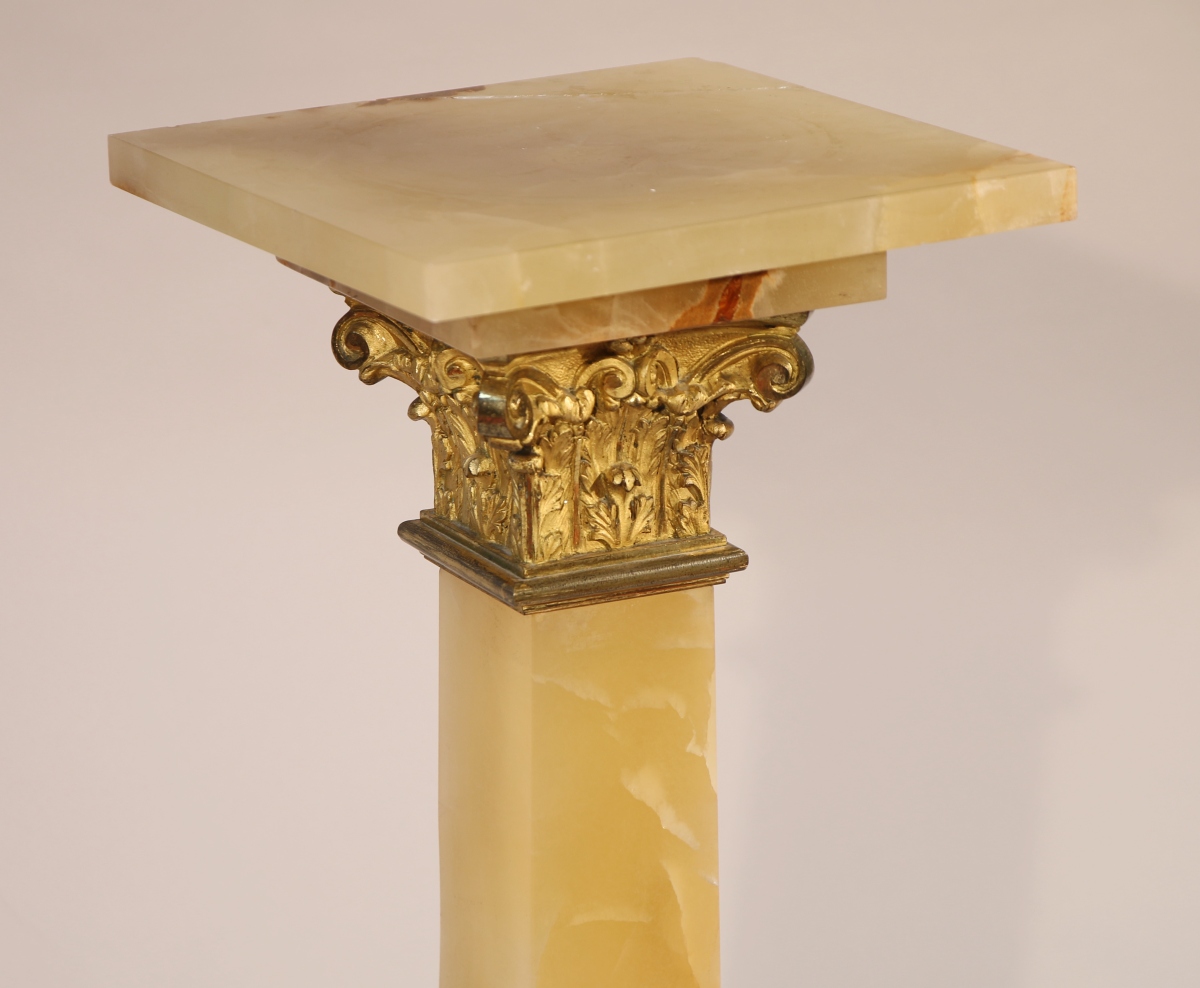 COLONNE en onyx formant SELLETTE de section rectangulaire, ornée d'un chapiteau corinthien en métal doré.