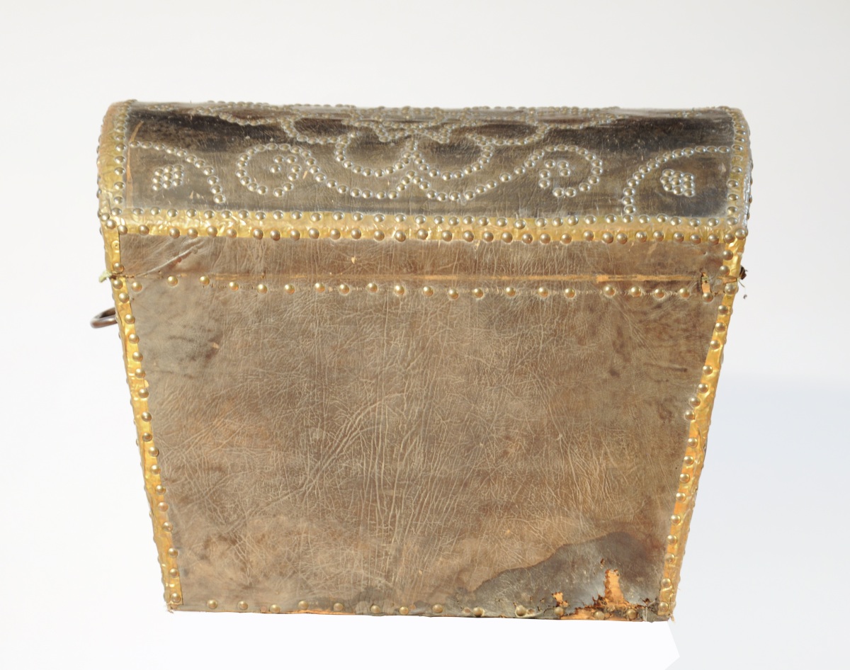 Petit COFFRE de VOYAGE de forme trapézoïdale à couvercle bombé gainé de cuir brun clouté de laiton à décor floral stylisé. Arêtes et coins renforcés de feuilles de laiton. Poignées latérales.