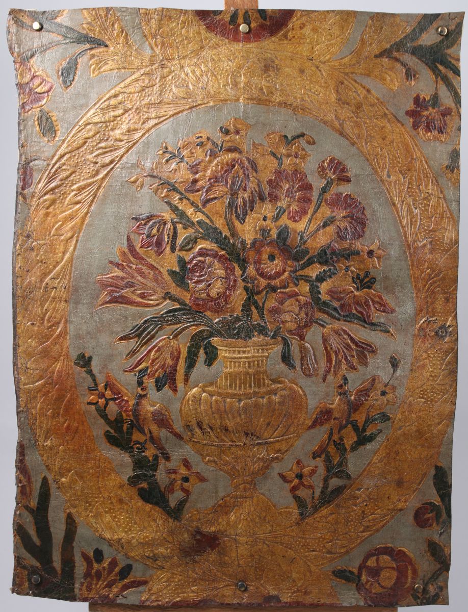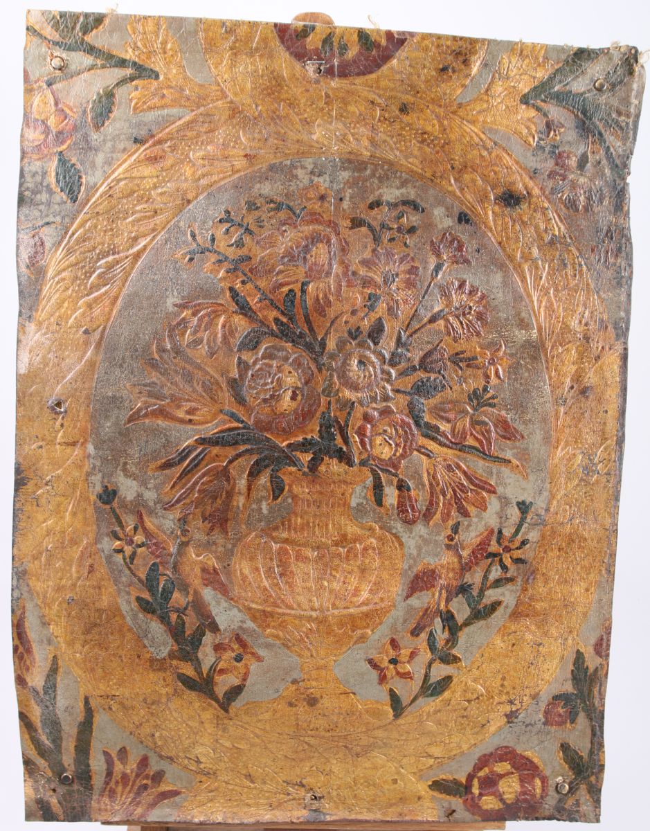 Deux PAIRES de panneaux en "CUIR DE CORDOUE" gaufré, polychrome et doré. Ils figurent, dans un médaillon central feuillagé, un large bouquets de fleurs dans un vase balustre godronné. Ce dernier flanqué de deux oiseaux.
