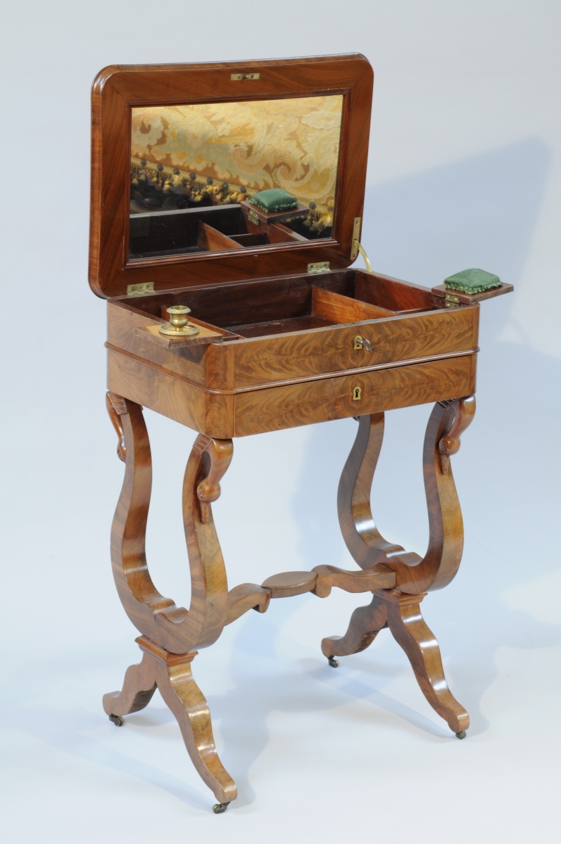 TABLE À OUVRAGE en acajou flamé et placage d'acajou reposant sur des piètement lyre à col de cygne réunis par une traverse. Elle ouvre par un tiroir en ceinture découvrant une écritoire. L'abattant foncé d'un miroir ouvre sur un coffre compartimenté.