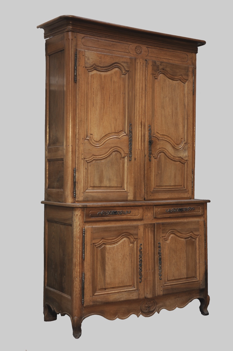 BUFFET DEUX-CORPS en merisier mouluré et sculpté. Il ouvre en façade par quatre vantaux et deux tiroir en ceinture. Montants arrondis et faux-dormants cannelés et rudentés. La traverse haute est centrée d'un fleuron. Traverse inférieure chantournée ornée en son centre d'un cartouche formé des deux agrafes affrontées renfermant un motif feuillagé.