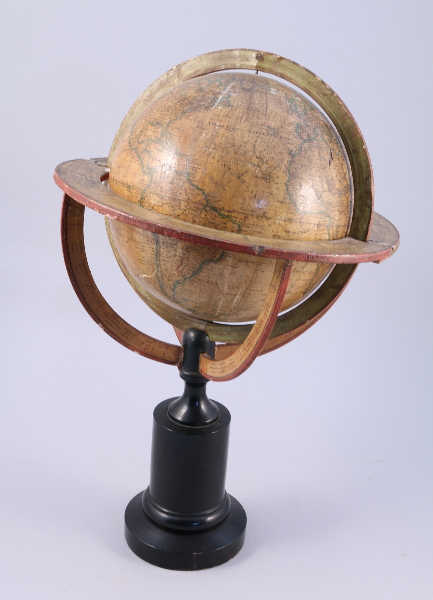 GLOBE TERRESTRE en carton et papier polychrome de la Maison Delamarche à Paris. La table équatoriale supportée par quatre armilles en carton et papier indiquant des longitudes et latitudes des villes principales. Cercle méridien. Repose sur un socle en base de colonne en bois tourné et noirci.