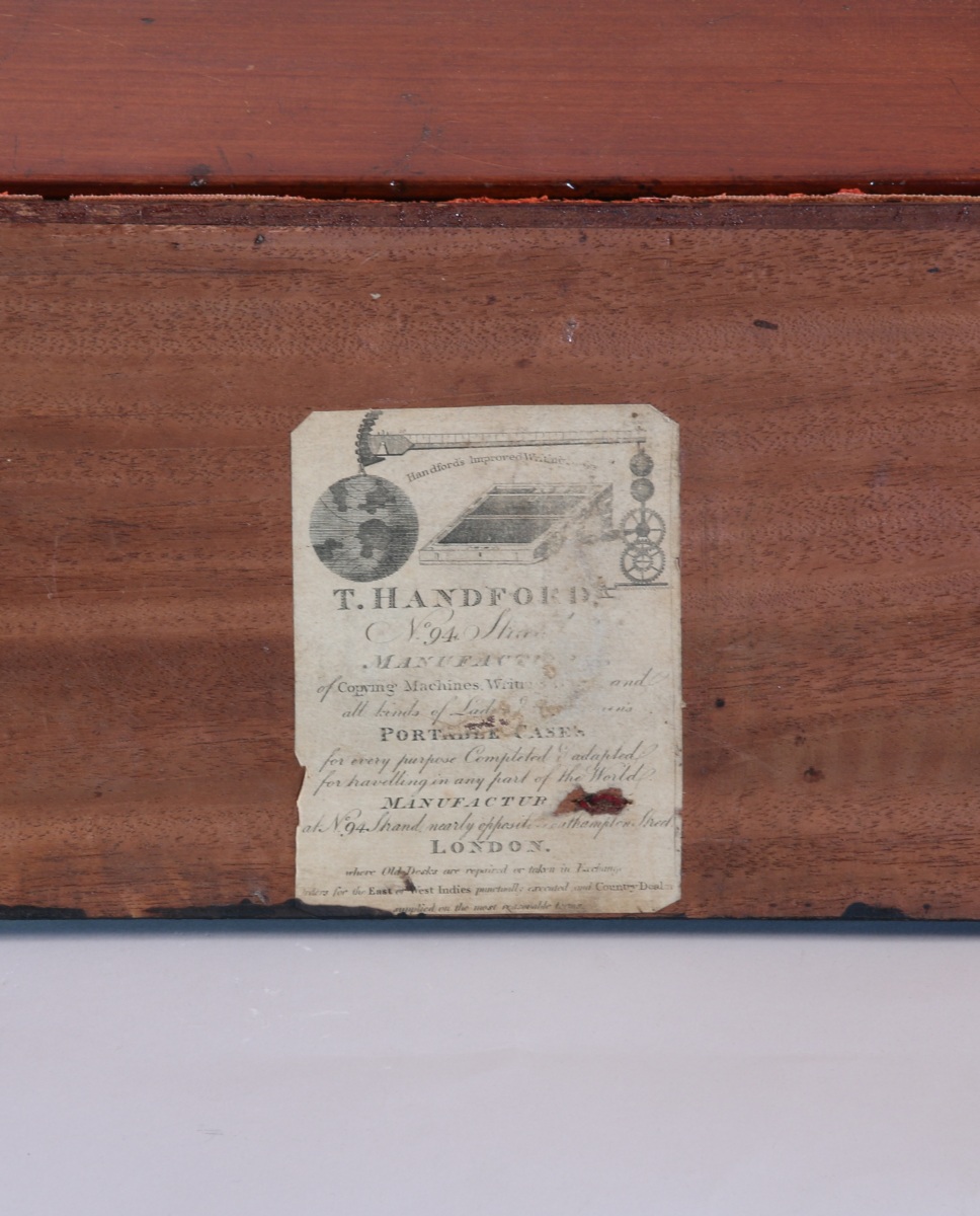 ÉCRITOIRE DE VOYAGE dite "de marine" de forme rectangulaire en acajou ouvrant pas un tiroir sur le côté. Écoinçon et renforts en laiton. Le centre du couvercle incrusté d'une plaque de laiton de forme rectangulaire monogrammée "SJW". Mains tombantes latérales. L'intérieur en bois noirci à deux abatants gaînés de cuir rouge découvrant deux niches. La partie supérieure à cinq compartiments. Étiquette de fabricant "T. Handford".