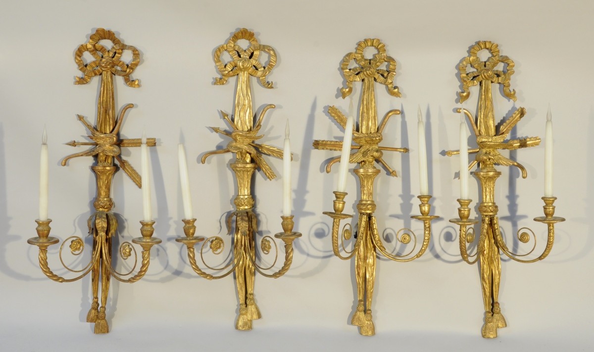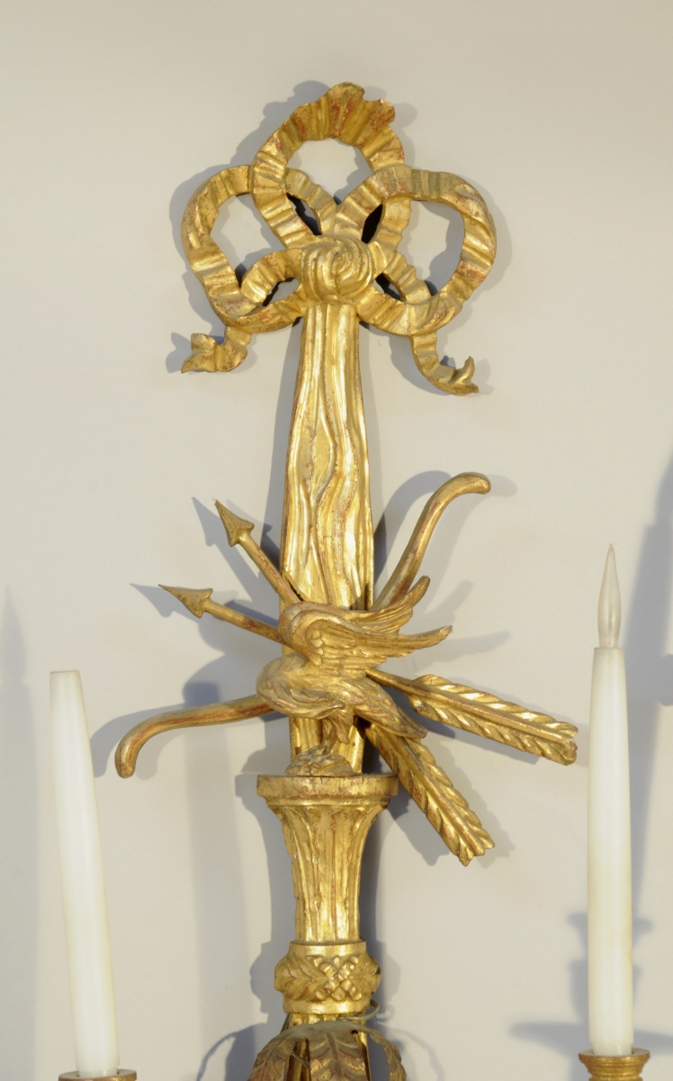 DEUX PAIRES D'APPLIQUES à deux bras de lumière formant SUITE en bois sculpté, stuqué et doré. Elles adoptent la forme de deux pièces d'étoffe retenues par un ruban noué et terminées par un gland. La partie centrale est ornée d'un aigle en ronde-bosse, arc et flèches, reposant sur une console feuillagée. Les bras de lumière à armature métallique agrémentée d'un fleuron pour une paire et d'un disque pour l'autre naissent de trois feuilles en tôle emboutie pour le premier modèle.