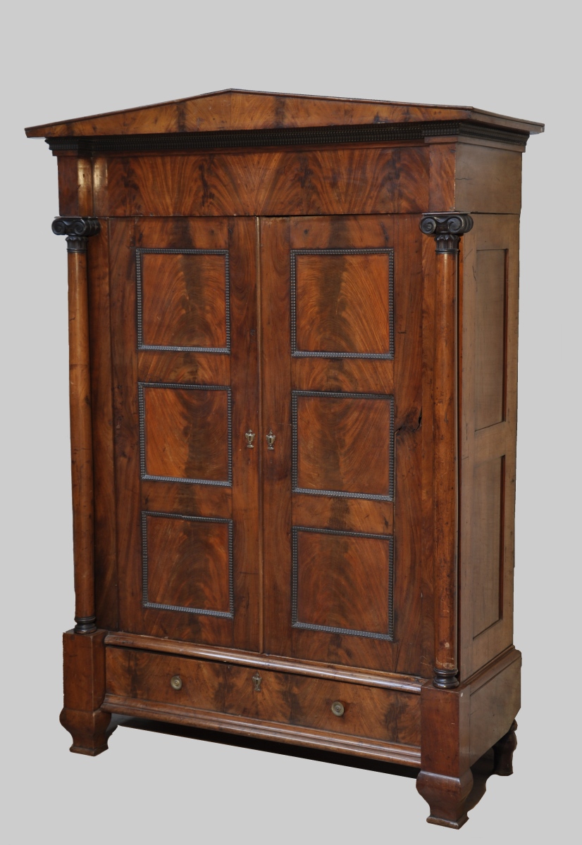 ARMOIRE À FRONTON de forme rectangulaire en placage d'acajou et baguettes de bois ondulé et noirci ouvrant par deux vantaux et un tiroir en partie inférieure. La façade flanquée de deux colonnes ioniques détachées, le chapiteau et la base en bois noirci. Garnitures en bronze telles que entrées de serrures en urne à têtes de bélier et poignées de tirage. Elle repose sur quatre pieds.