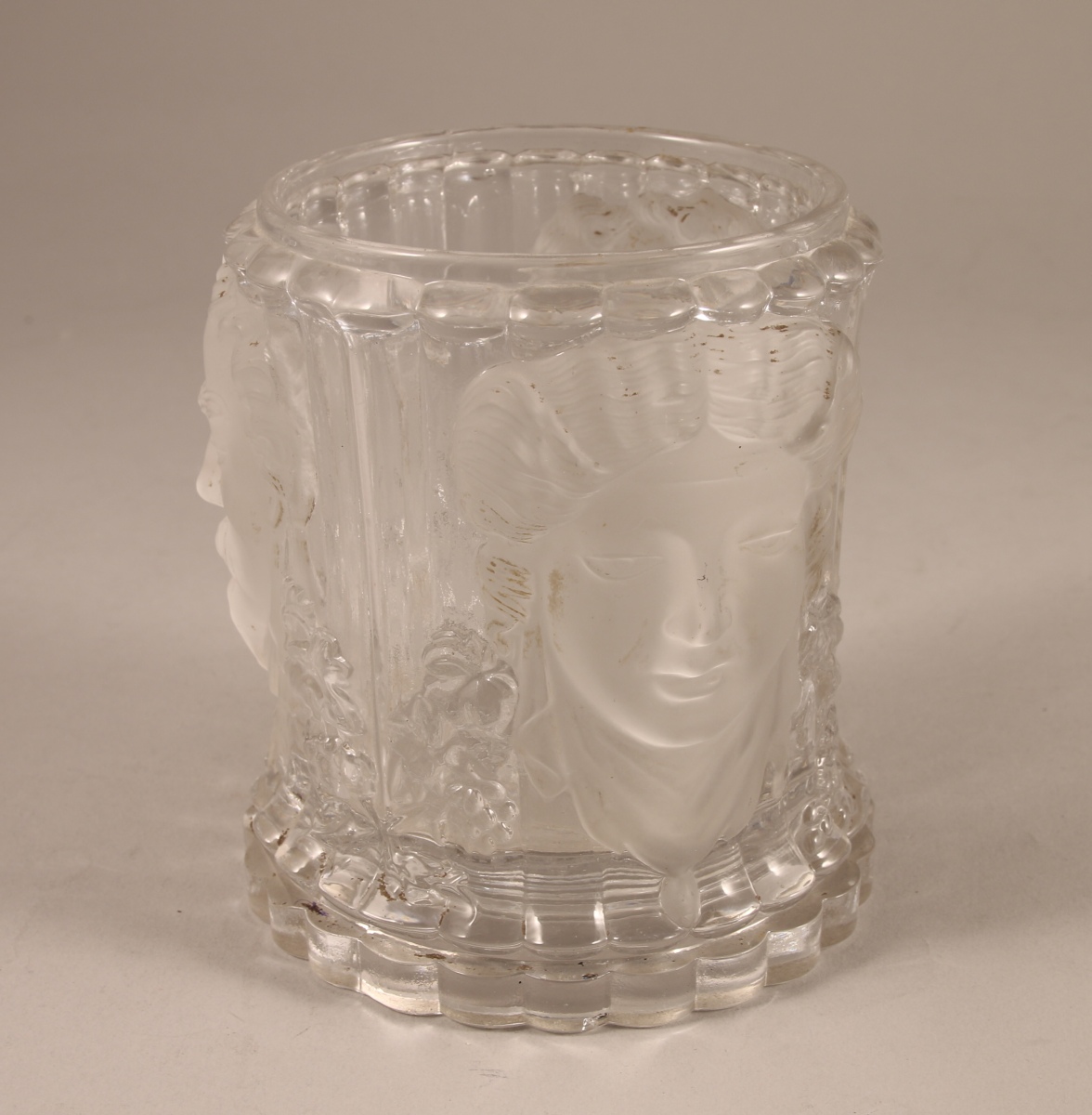 POT de forme tronconique en verre moulé et pressé à décor de godrons et de trois visages, l'un féminin, les deux autres masculins.