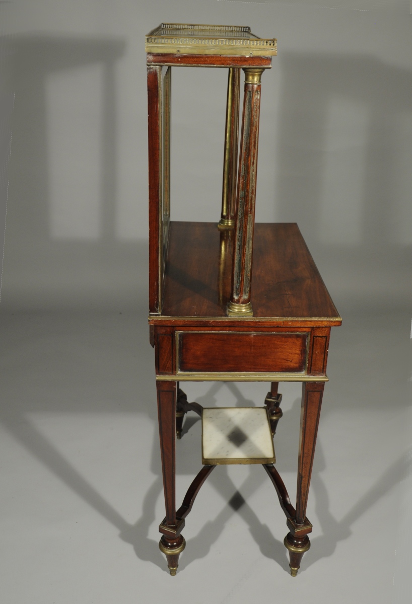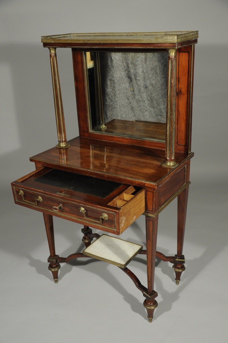BONHEUR DU JOUR à fond de glace en acajou et placage d'acajou. Il ouvre en façade par un tiroir en ceinture découvrant une écritoire. Dessus de marbre blanc serti d'une galerie de bronze ajouré soutenu par deux colonnes à cannelures garnies de laiton. Repose sur quatre pieds gaine terminés par une toupie et réunis par une entretoise en X centrée d'une tablette foncée de marbre blanc.