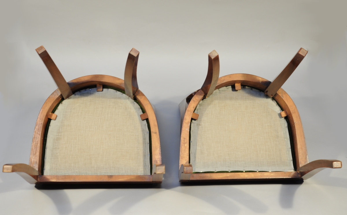 Paire de CHAISES GONDOLES en noyer teinté acajou. Reposent sur quatre pieds sabres.