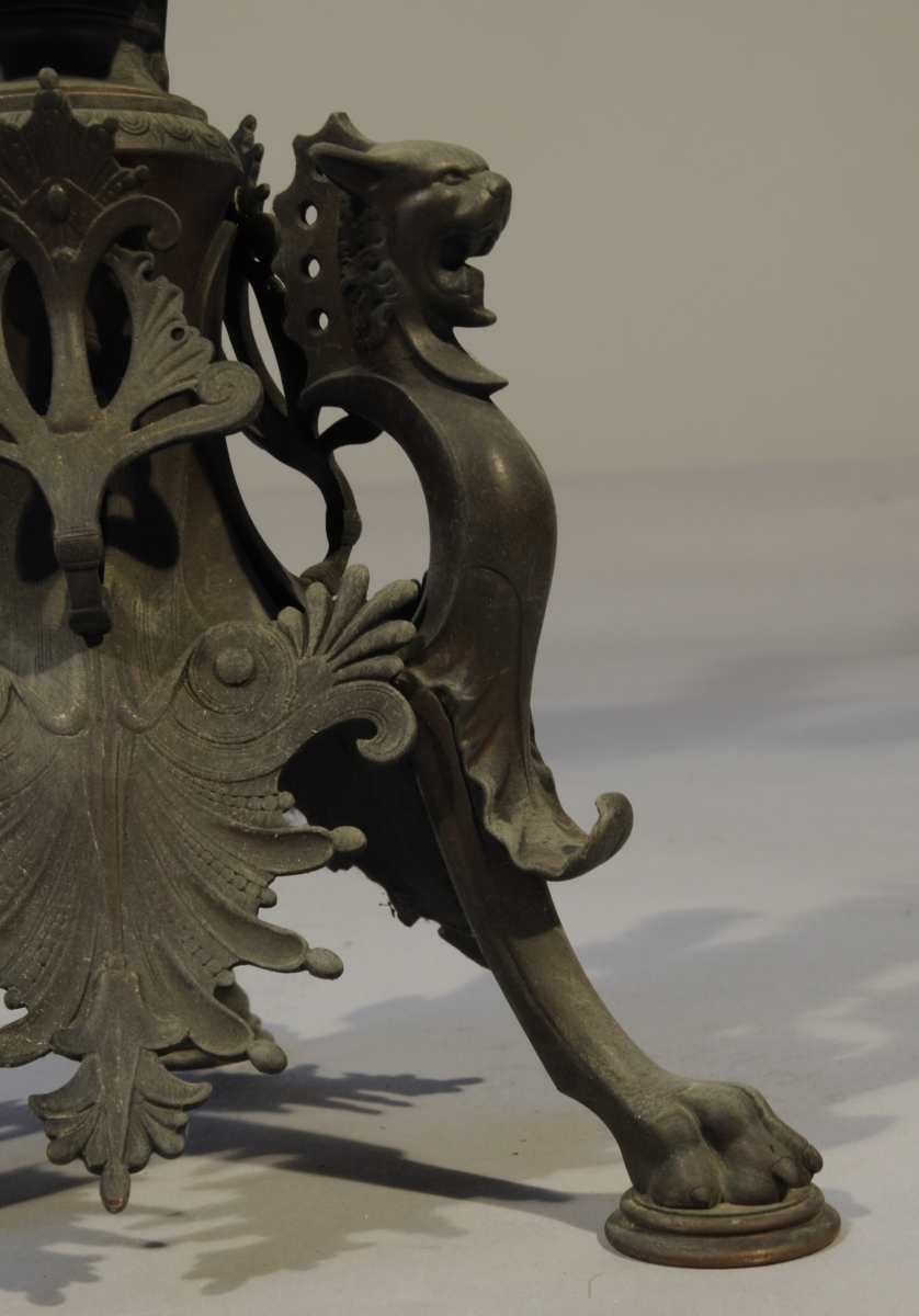 PAIRE DE CANDÉLABRES en bronze patiné à cinq bras de lumière. Fût cannelé à chainettes reposant sur un buste de femme en hermès. Base tripode à griffes de lions, têtes de griffons et palmettes. Une grue sur un socle à la partie supérieure.