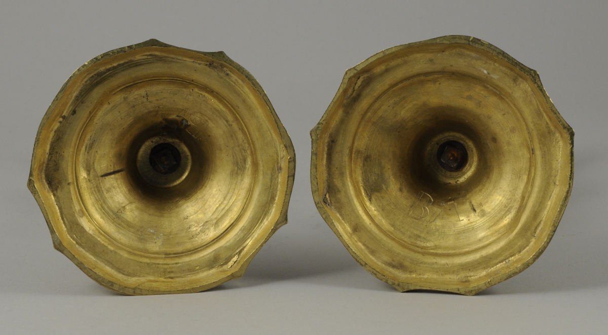 PAIRE DE FLAMBEAUX en bronze doré. La base chantournée et moulurée ornée de feuillages. Ombilic à décor de coquilles. Collet inférieur mouluré, supportant un fût balustre orné de cartouches rocaille, feuillages et volutes. Binet orné de feuilles d'acanthe. Bobèche circulaire à bord chantourné. Marqués sous la base "B / I".