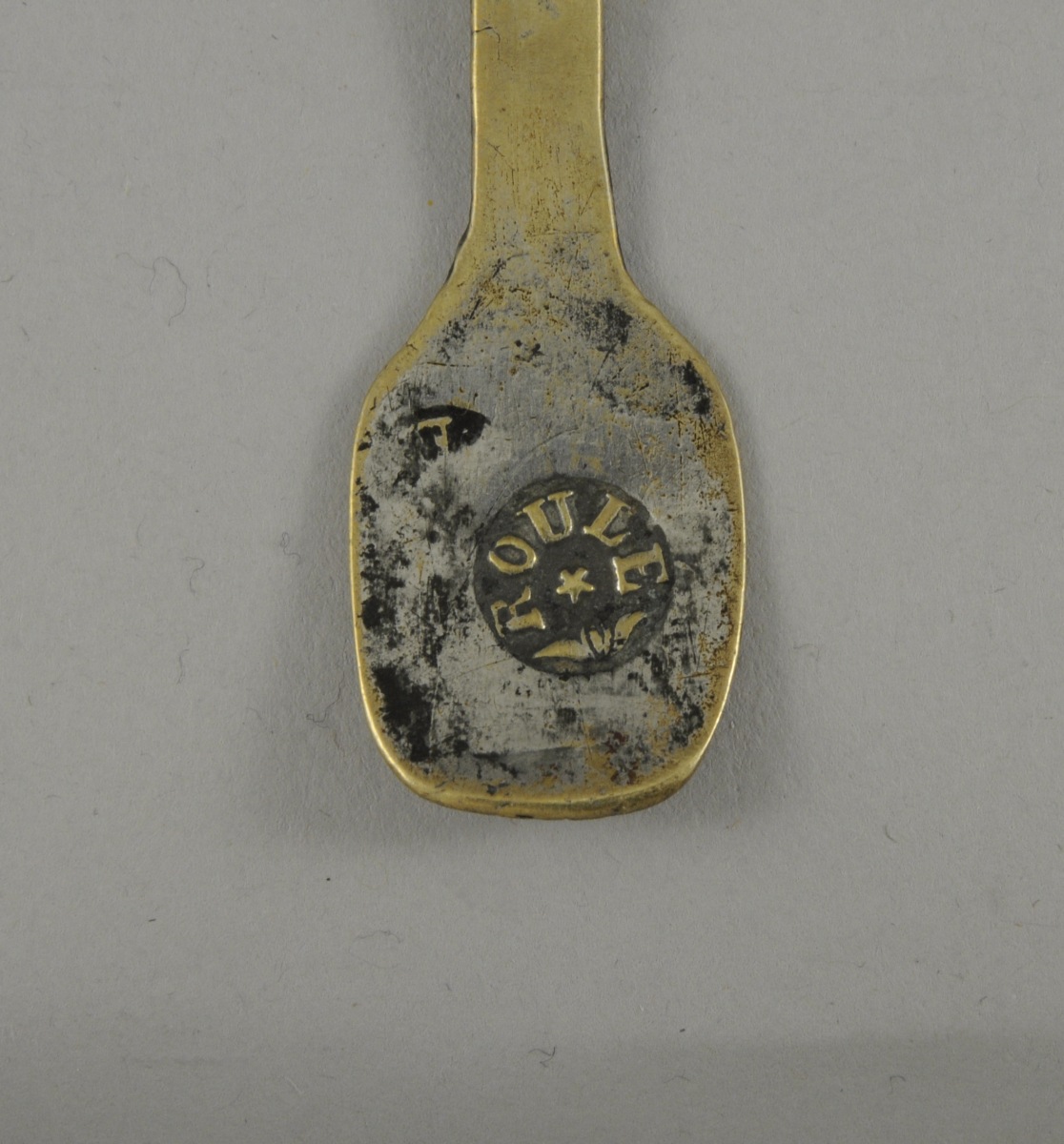 - La première en laiton étamé. Elle possède un large cuilleron. Le manche terminé par une spatule marquée "ROULE" dans un cercle centré d'une étoile. Travail ancien, Normandie? Long. 18,3 cm. (manque à l'étain)