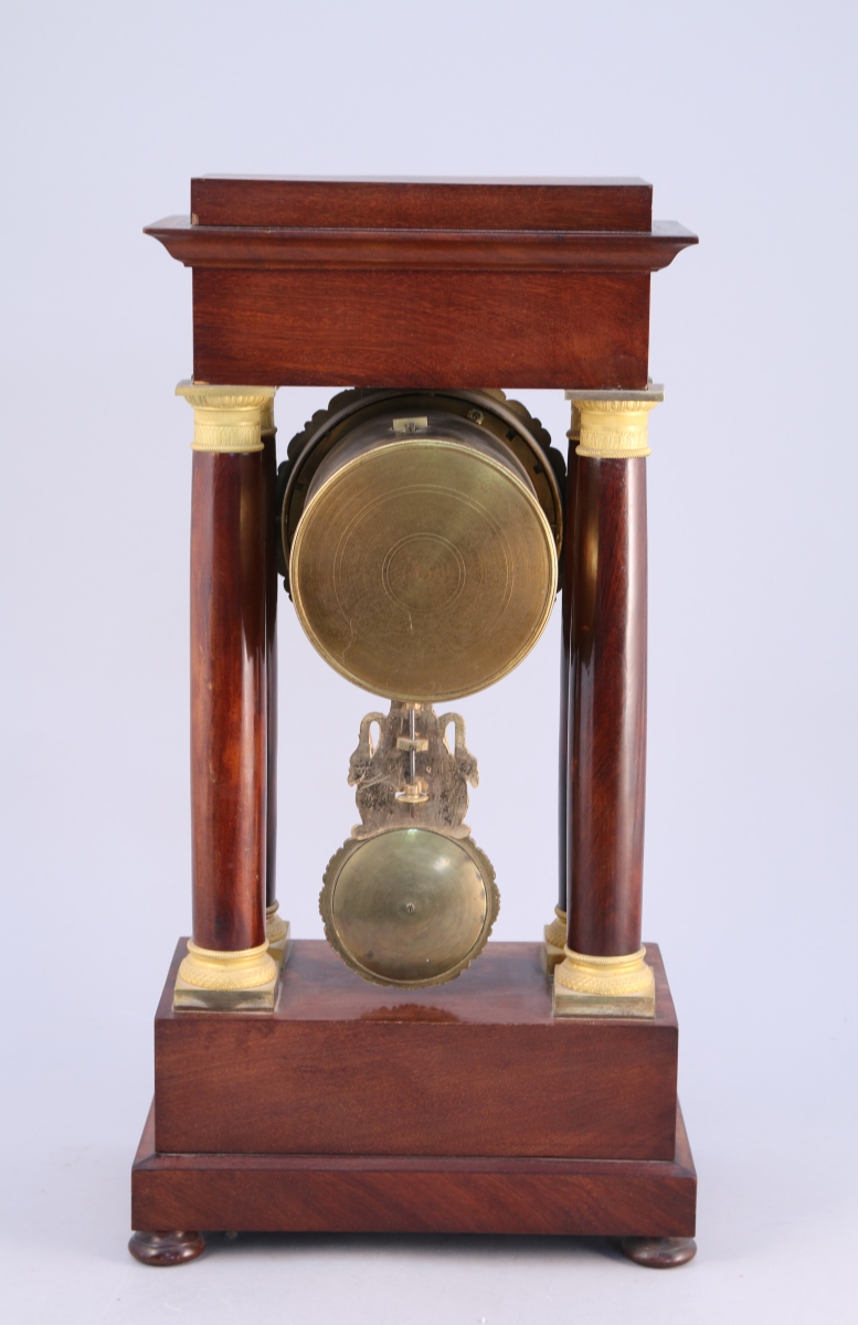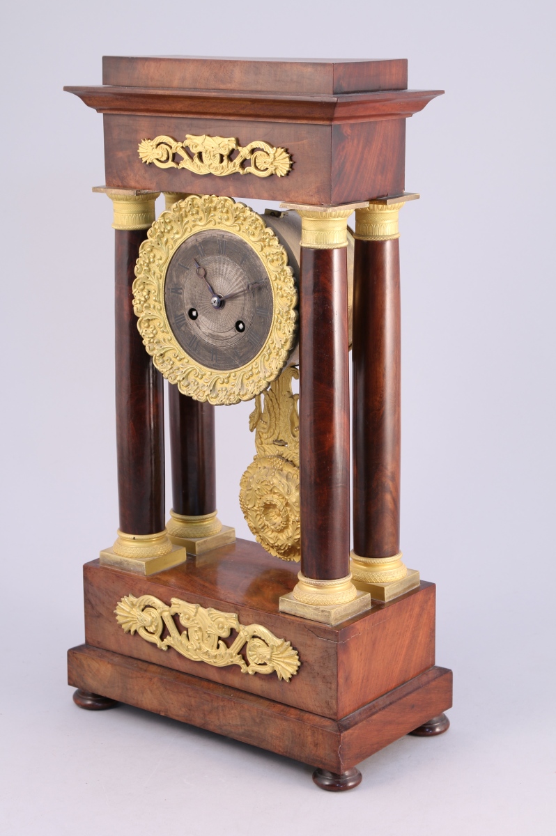 PENDULE PORTIQUE À COLONNES en placage d'acajou. L'entablement à doucine retenu par quatre colonnes d'ordre dorique enserrant le mouvement. Base en plinthe reposant sur quatre pieds en boule aplatie. Garniture de bronzes ciselés et dorés tels que applications sur la base et l'entablement à décor ajouré de dauphins et palmettes, chapiteaux et bases des colonnes à frises de feuilles d'eau et tores de lauriers. Cadran en métal argenté indiquant les heures en chiffres romains serti d'une frise de feuillages stylisés. Balancier à riche décor de fleurs et feuillages sommés de deux cygnes adossés.