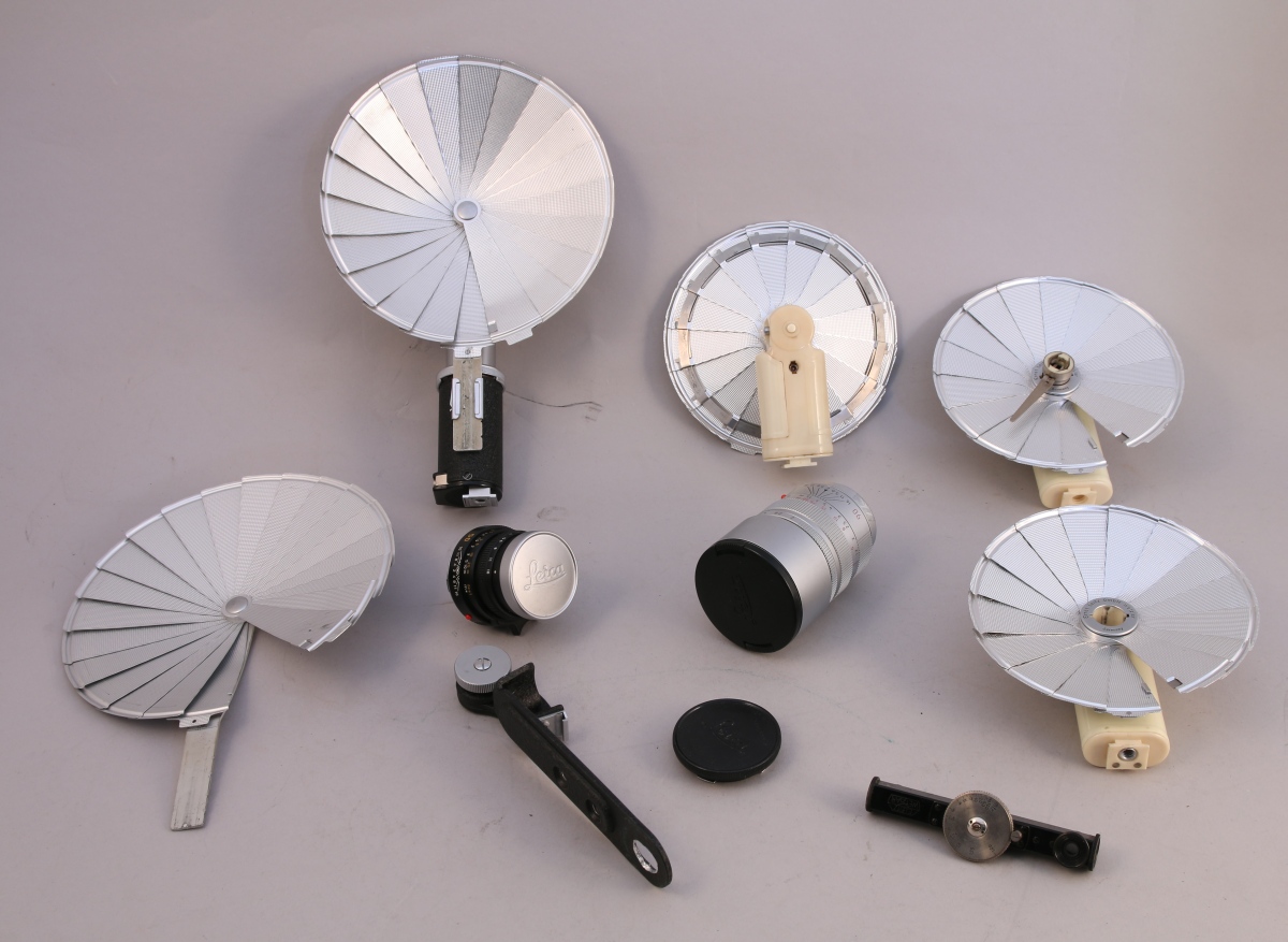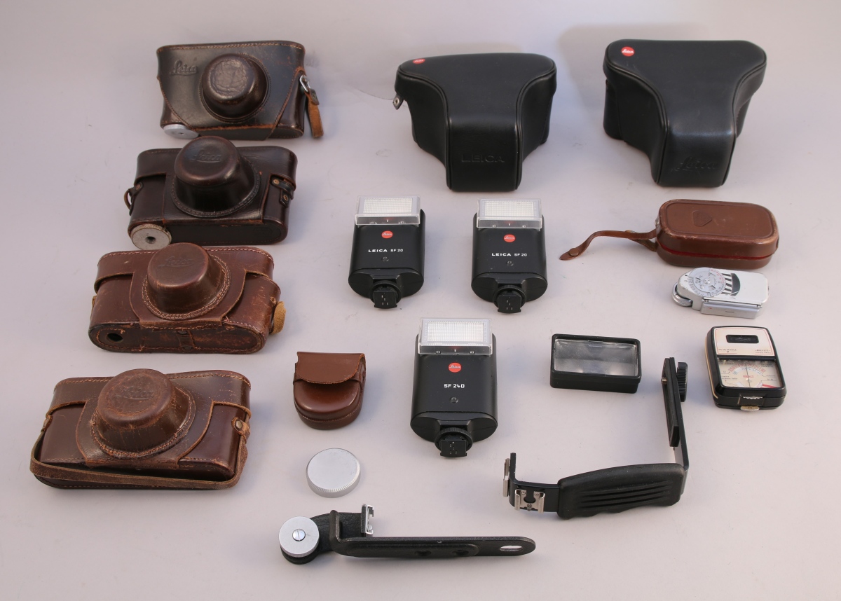 Divers accessoires dont 2 flashes SF20, 1 flash SF24 D, 2 cellules et 6 étuis Leica en cuir.