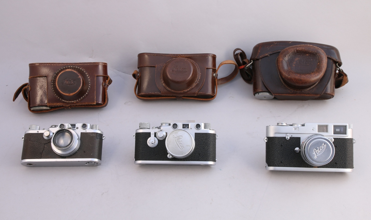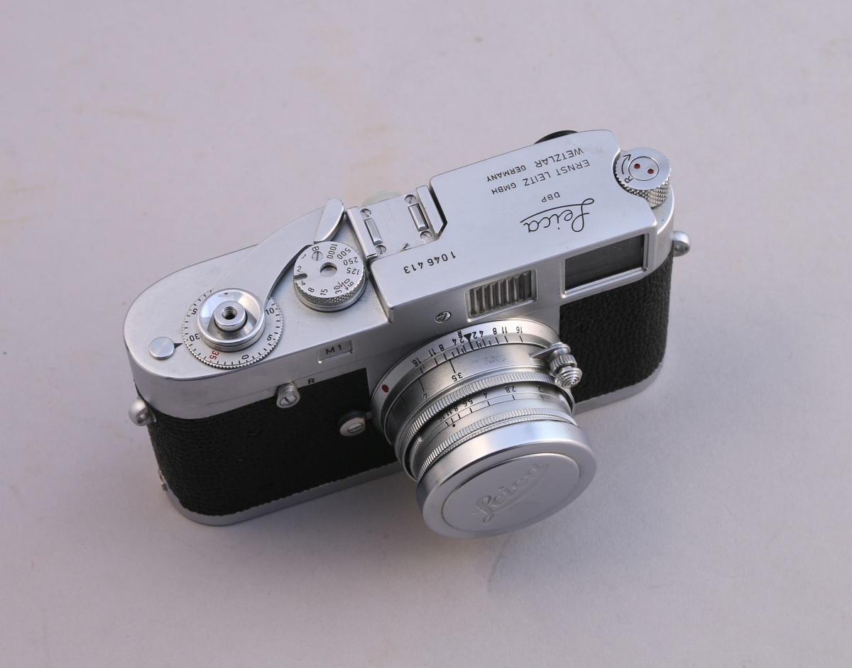 Leica M1 No 1046413 avec objectif Summicron F = 5 cm 1:2 No 1144197, avec sacoche usagée.