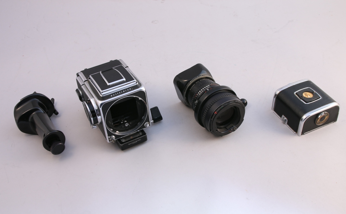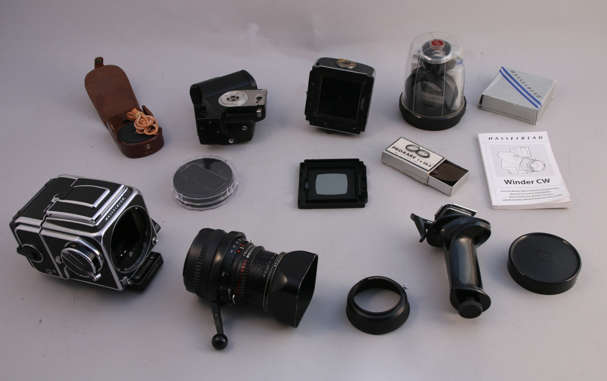 HASSELBLAD 500 C avec objectif Sonnar Synchro Compur 1:4 f = 150 mm No 5799811 avec pare soleil. Poignée support, accessoires divers et documentation.