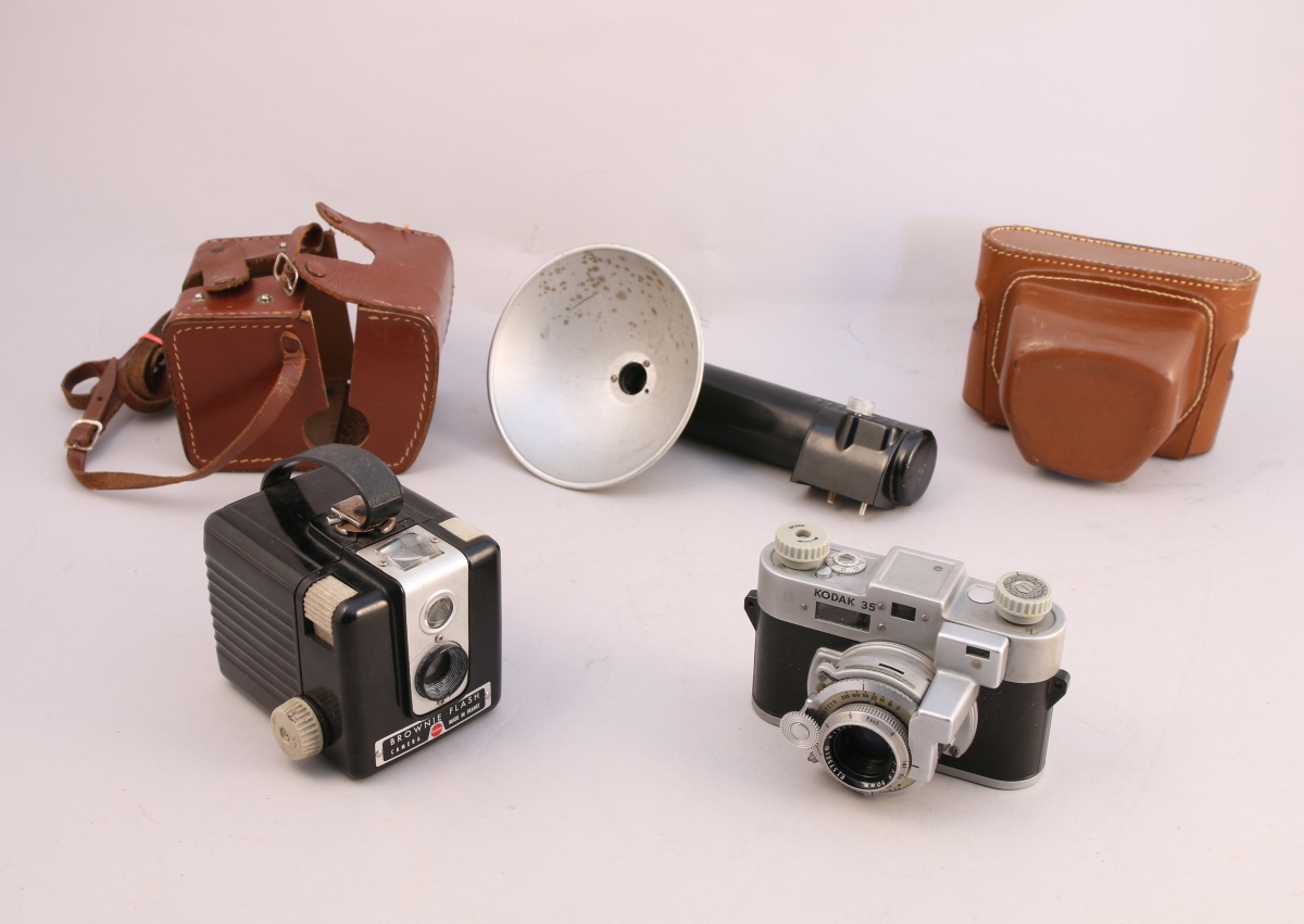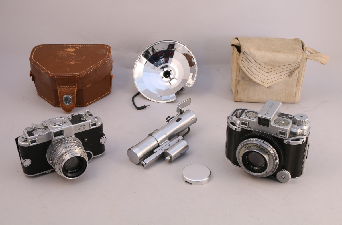 Kodak Medialist Supermatic No 2 No EE5934 avec sacoche en toile. Kodak Ektra avec objectif Ektar f:1.9 60 mm avec étui et un flash senior synchoniser.