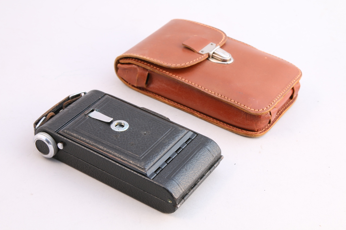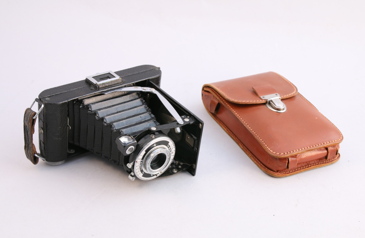 Appareil à soufflet avec objectif Lumière « FIDOR » Anastigmat 6.3-32 mm, avec étui en cuir et table des temps de pose.